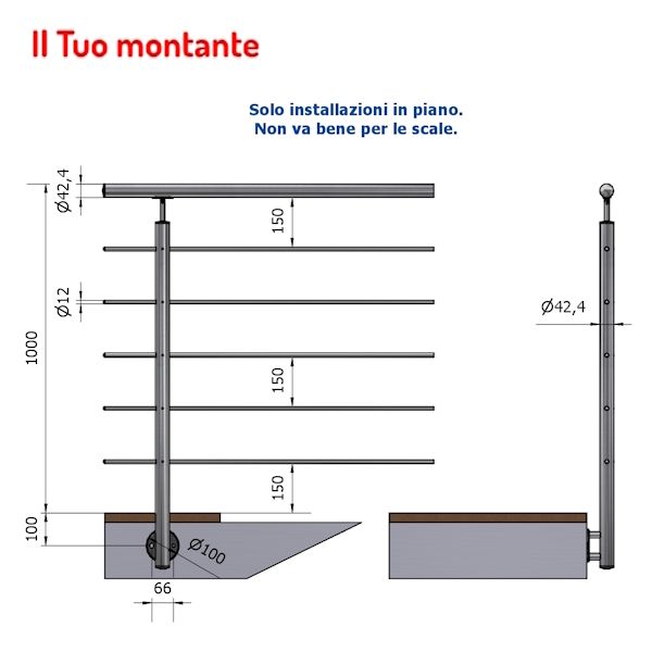ราวสเตนเลสซาตินสำหรับยึดตรงความสูง1.00ม. 5รู Ø 12.5 Aisi 304ความสูง5รูเส้นผ่านศูนย์กลาง42.4มม.