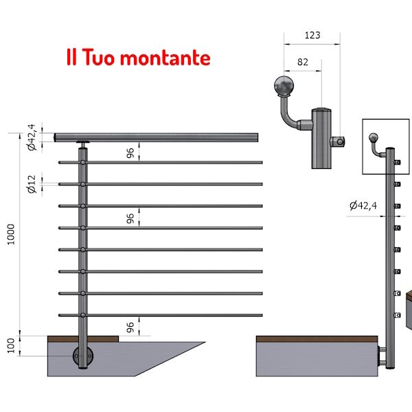 P110132-8 A4-L Upright Handrail 8 Crossbeams Polished AISI 316 Stainless Steel Ø 42.4 Offset Side Fixing Balustrades Handrails