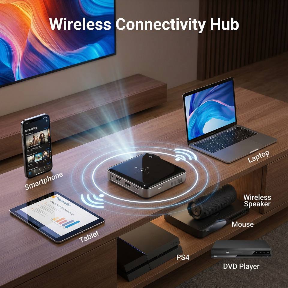 แบตเตอรี่ในตัว: สามารถใช้งานแบบพกพาได้นานสูงสุด 1.5 ชั่วโมง ทำให้สะดวกสำหรับการนำเสนอขณะเดินทางหรือคืนภาพยนตร์กลางแจ้ง