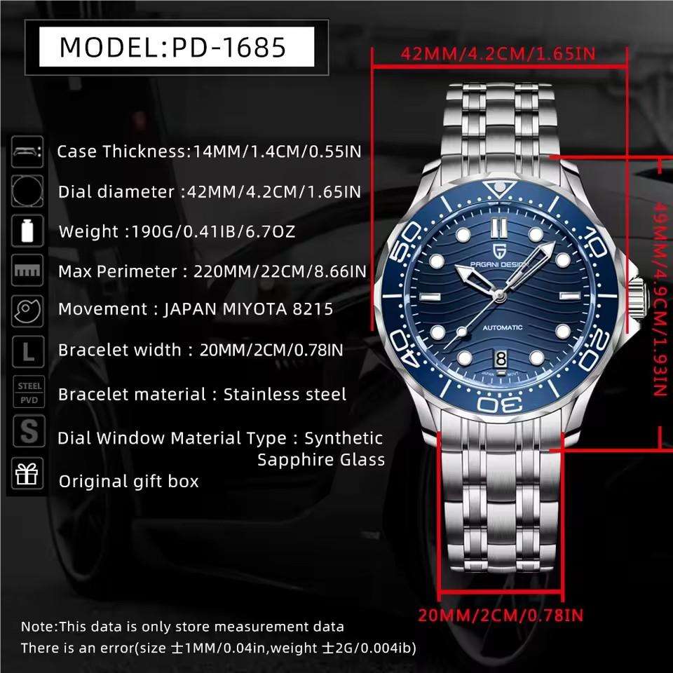 นาฬิกาข้อมือผู้ชาย PAGANI DESIGN รุ่น PD-1685 ระบบอัตโนมัติ ตัวเรือนสแตนเลสสตีล ดีไซน์สปอร์ต พร้อมกลไก 8215 ขอบหน้าปัดเซรามิก