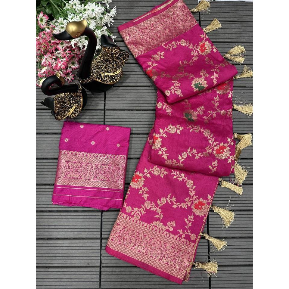 ชุดปาร์ตี้ dola Silk zari ใส่ทำงาน Saree กับเสื้อ unstitched สีชมพู
