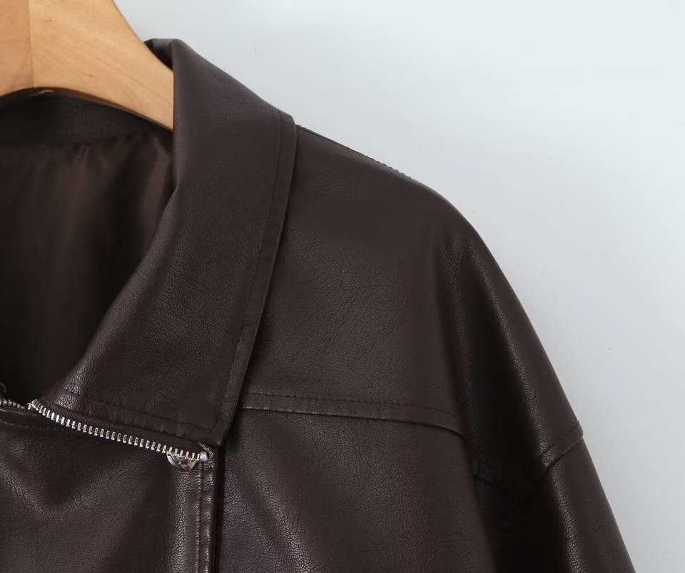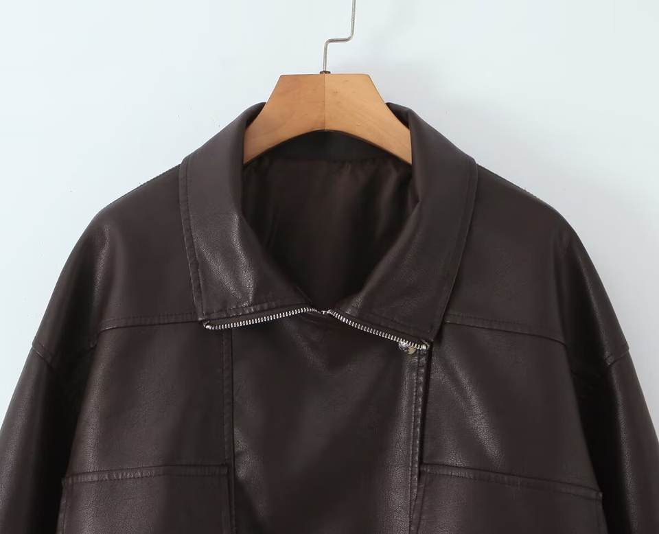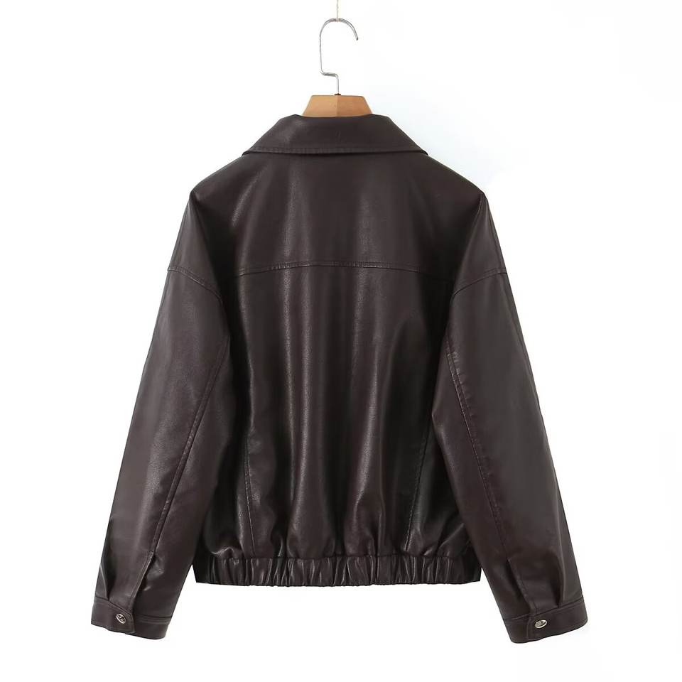 PB & ZA แจ็กเก็ตหนังมีกระเป๋าสไตล์เรโทรลำลองทรงหลวมสำหรับผู้หญิงฤดูใบไม้ร่วง2025