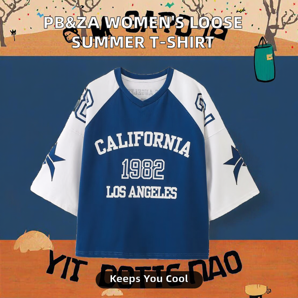 เสื้อยืดแขนสั้นผู้หญิง PB&ZA รุ่นปกติ ผ้าฝ้าย 100% คอกลม ระบายอากาศได้ดี ไม่เป็นขุย พิมพ์ลายดิจิทัล สวมใส่สบาย