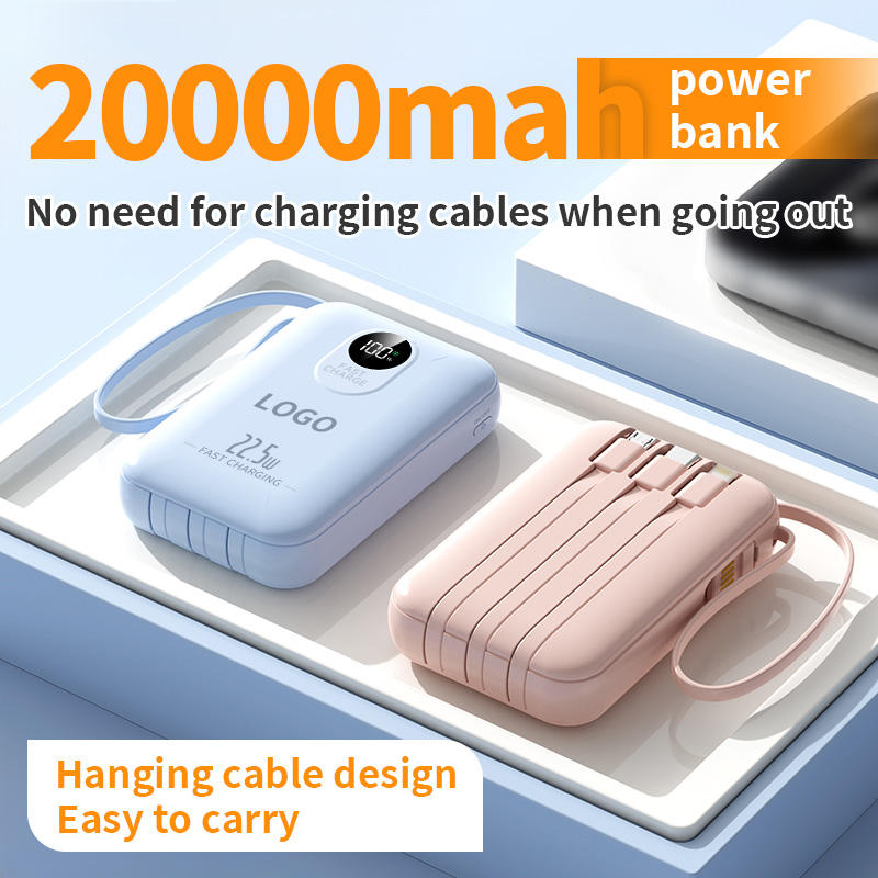 แบตเตอรี่ลิเธียมโพลิเมอร์แบบ Type-C ชาร์จเร็ว PD 22.5W ความจุสูง 20000mAh สำหรับใช้งานกลางแจ้ง พร้อมสายชาร์จในตัว 4 เส้น และไฟฉาย LED 2 ดวง