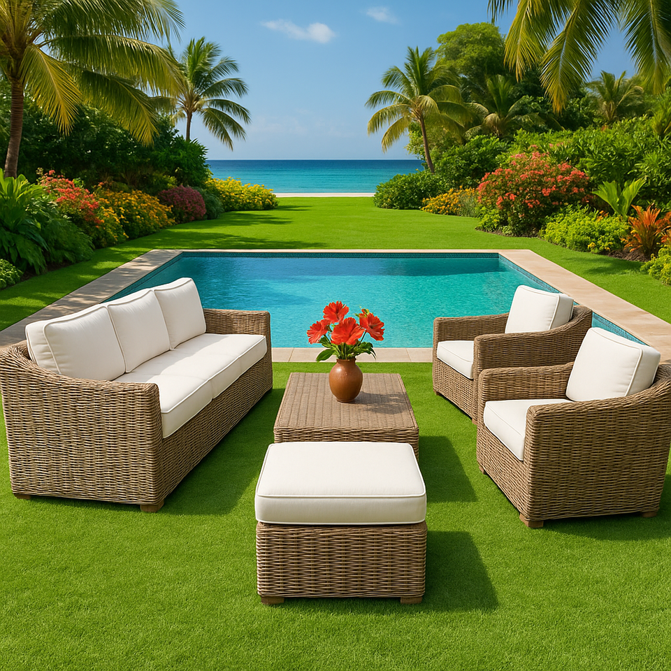 ชุดโซฟาหวาย PE แบบแบ่งส่วนกลางแจ้งพร้อมเบาะซักได้และโต๊ะกระจกสำหรับระเบียงดาดฟ้าลานหรือลานโรงแรม