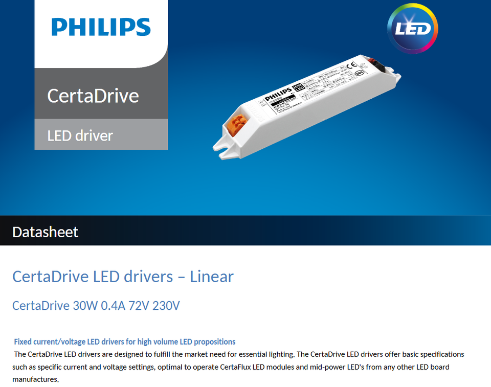 Phillipss certadrive 30W 0.4A 72V 230V เคสพลาสติกไดรเวอร์ LED มีอายุการใช้งาน30,000ชั่วโมงสำหรับไฟ LED