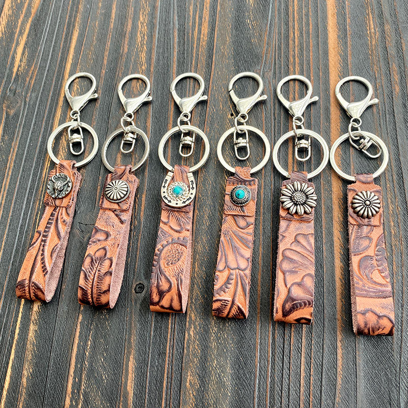 พวงกุญแจหนังวัวสไตล์เรโทรตะวันตก รุ่น PIN PIN A26005 พร้อมสายคล้องข้อมือหนังลายนูนคาวบอย และจี้ห้อยกุญแจรถแบบสลักลายหนังวัว