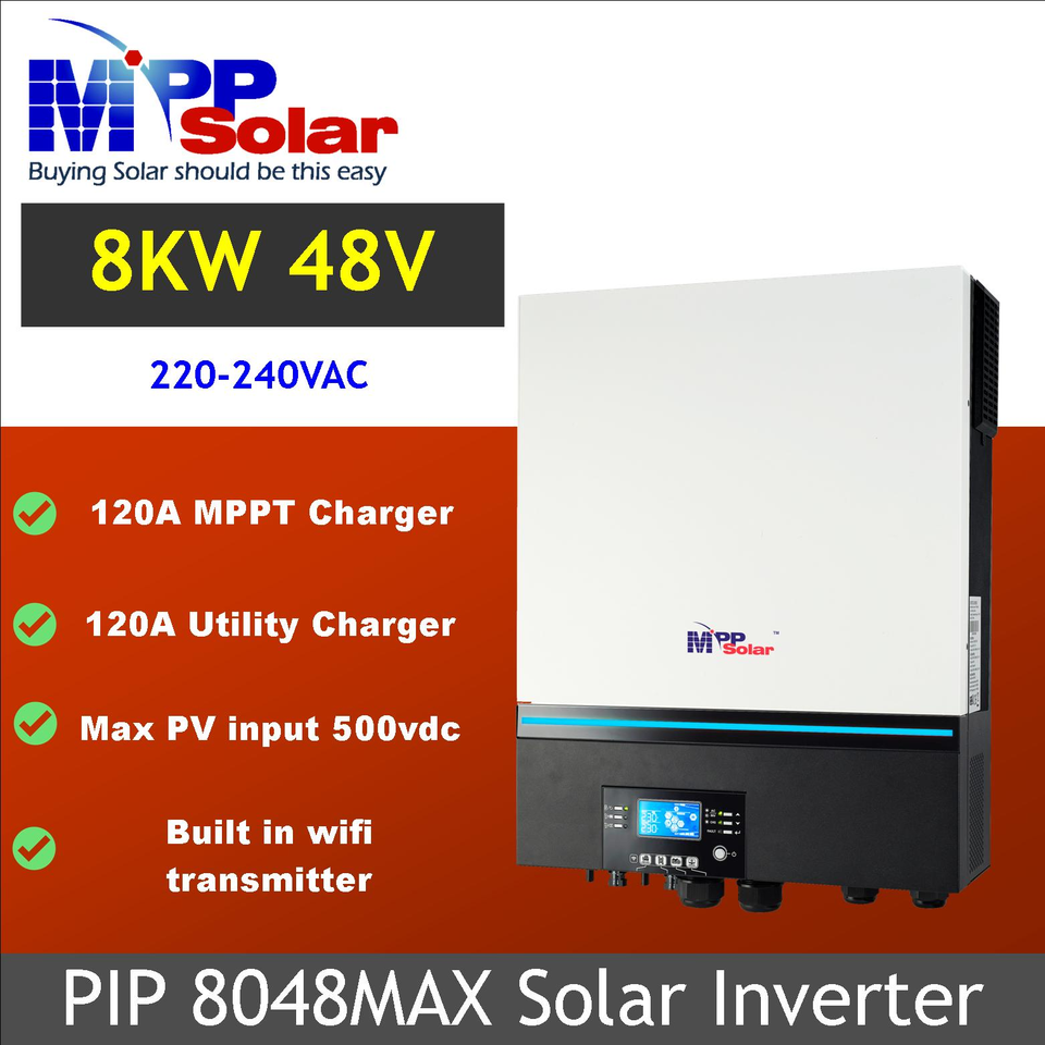 อินเวอร์เตอร์พลังงานแสงอาทิตย์ PIP8048MAX 8000w 48v 230v MPP พร้อมระบบชาร์จพลังงานแสงอาทิตย์ 2 MPPT รองรับแรงดันไฟฟ้าสูง 500v พร้อม Wifi คลื่นไซน์บริสุทธิ์ แบบออฟกริด