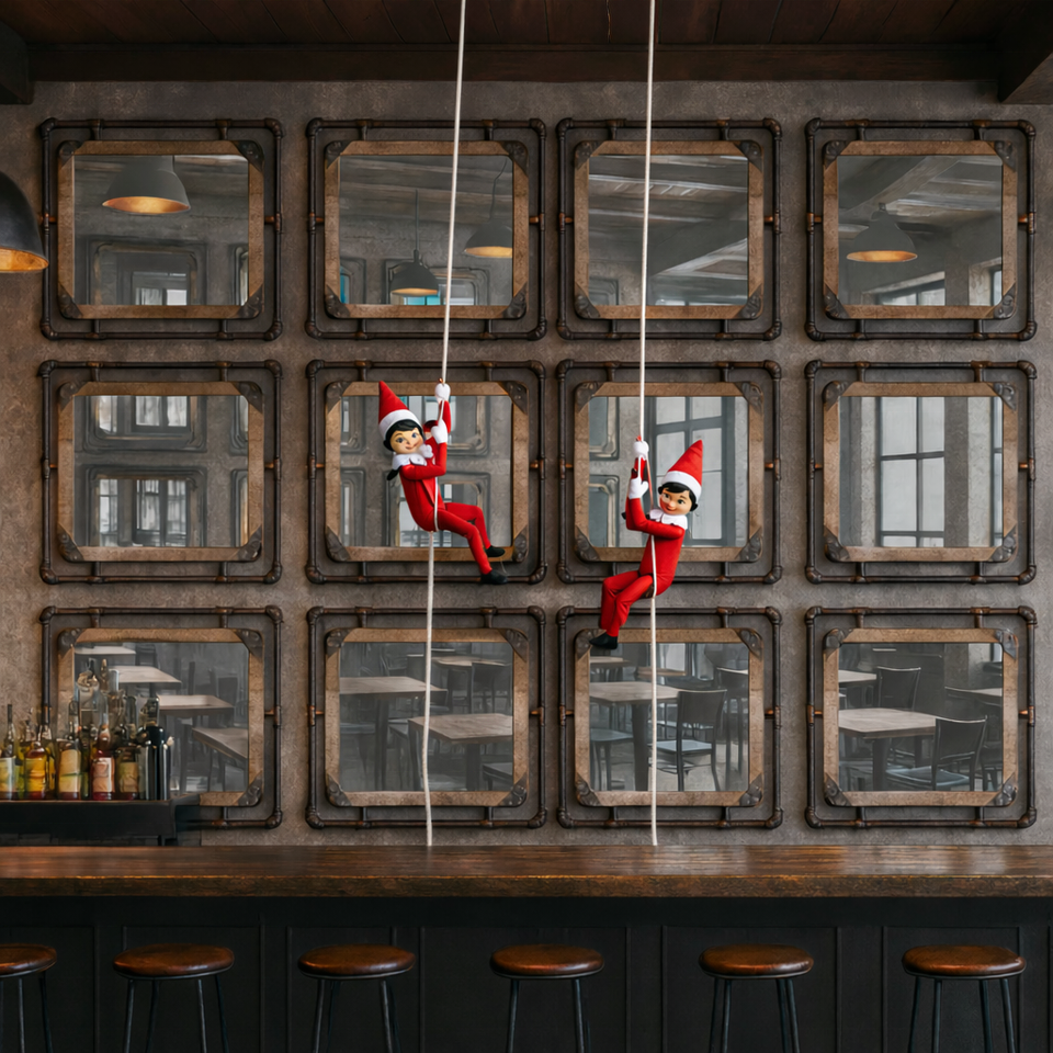กระจกติดผนังโครงท่ออุตสาหกรรมไม้รีไซเคิล | งานตกแต่งที่ทันสมัย | ตกแต่งภายในบาร์ ร้านอาหาร ห้องรับประทานอาหาร และห้องนั่งเล่น