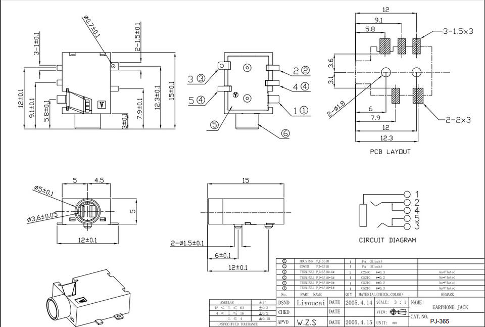 PJ-365 ช่องเสียบแจ็คเสียงสเตอริโอขนาด 3.5 มม., แบบติดตั้ง SMT 5 พิน พร้อมหน้าสัมผัสเคลือบทอง, ขั้วต่อตัวเมียคุณภาพพรีเมียม