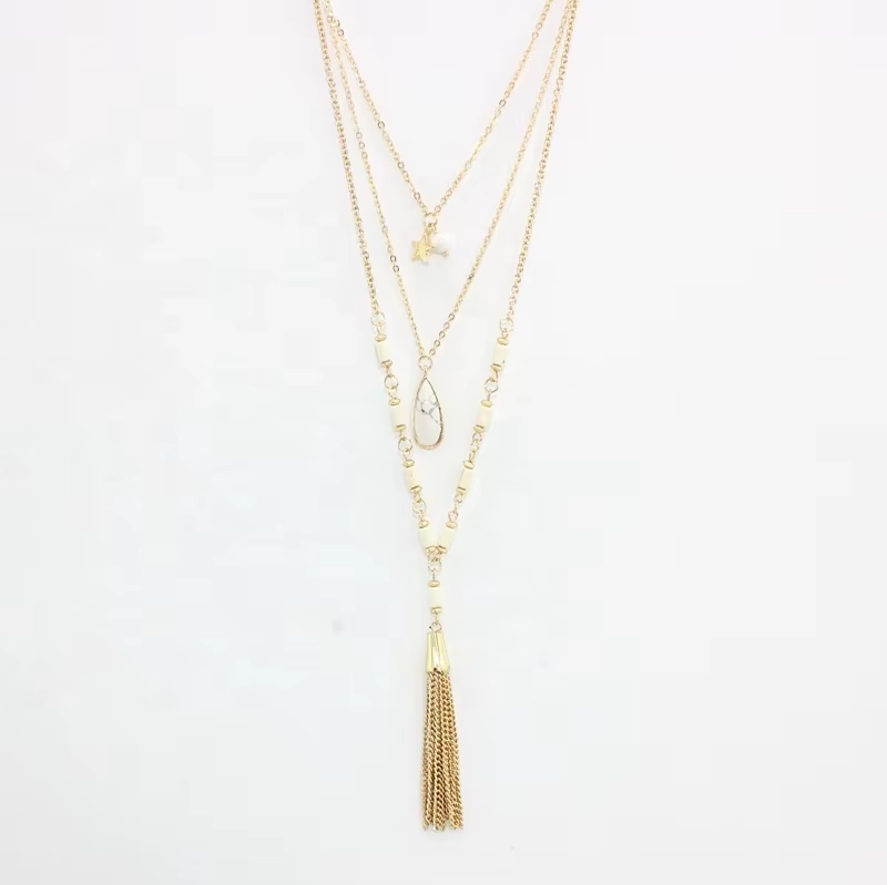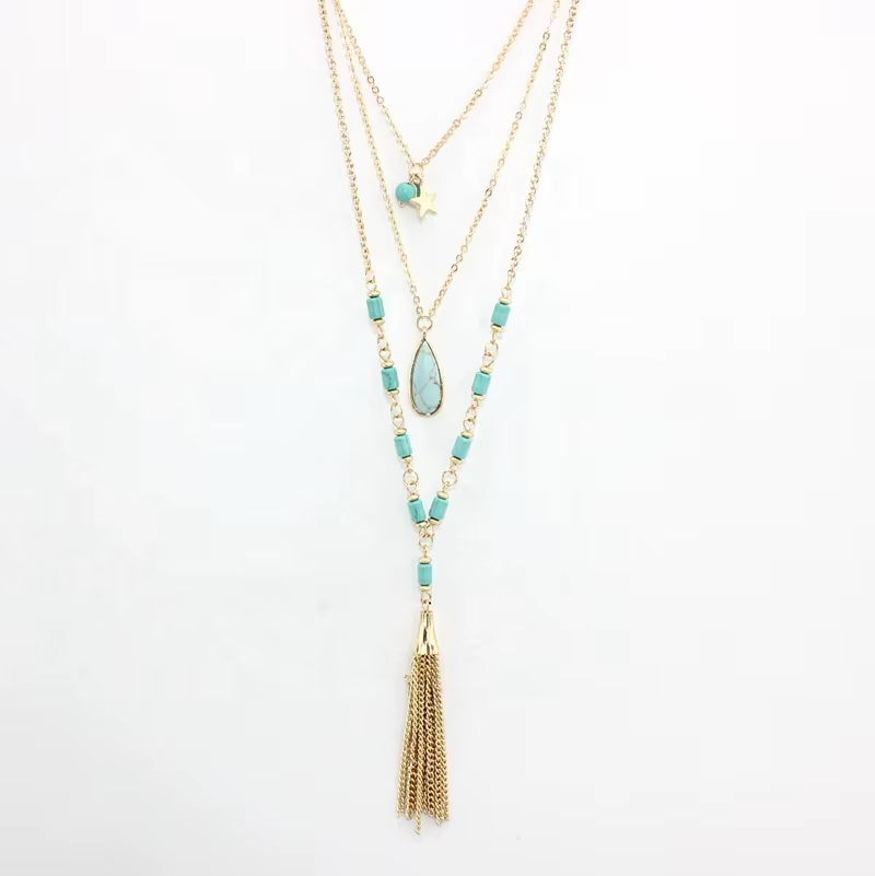 ชุดสร้อยคอพร้อมต่างหูประดับพู่สีเทอร์ควอยซ์ รุ่น PJ-C484 สไตล์โบฮีเมียน ชุบทอง พร้อมสร้อยคล้องเสื้อ เครื่องประดับแฟชั่น ของขวัญคุณภาพสูง