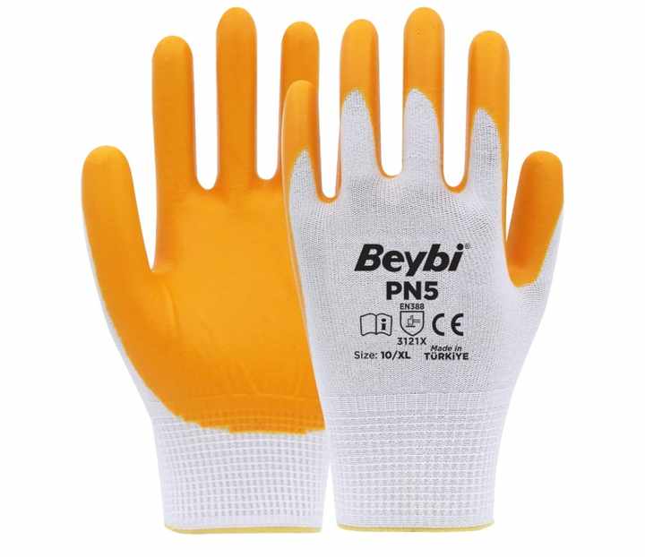 ถุงมือยางไนไตรล์แบบถักทำจากโพลีเอสเตอร์สีเหลือง PN5เคลือบครึ่งไนไตรล์