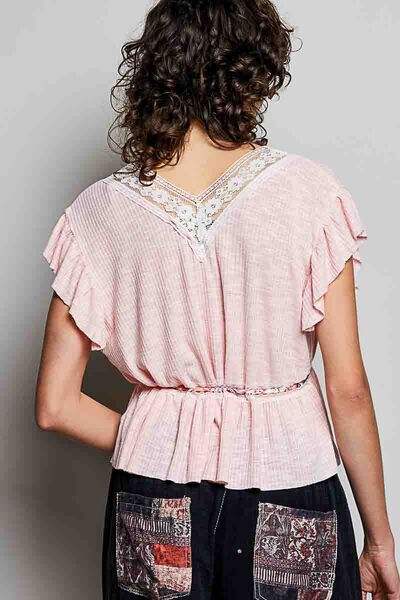 เสื้อเบลาส์แขนสั้นคอวีผูกด้วยลูกไม้