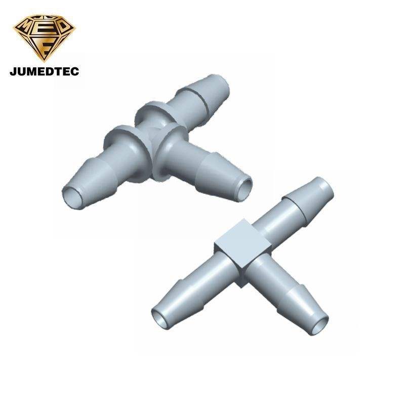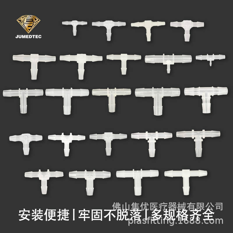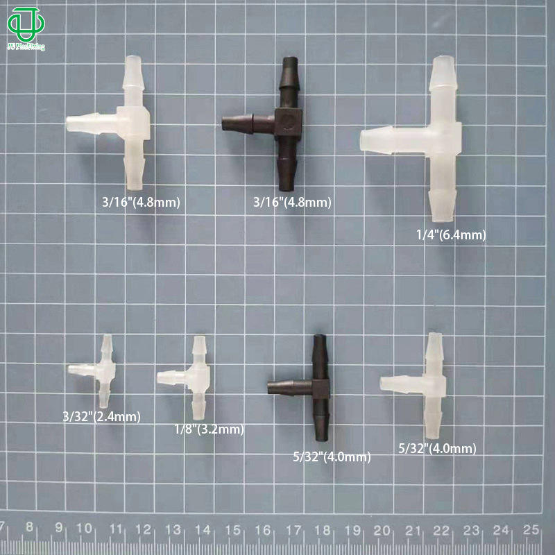 ข้อต่อสามทางแบบมีหนาม PP-Nylon ขนาด 3/32 ถึง 1/4 นิ้ว สีขาวดำ สำหรับท่ออ่อนแบบยืดหยุ่น ใช้สำหรับงานประปาและการถ่ายโอนของเหลว
