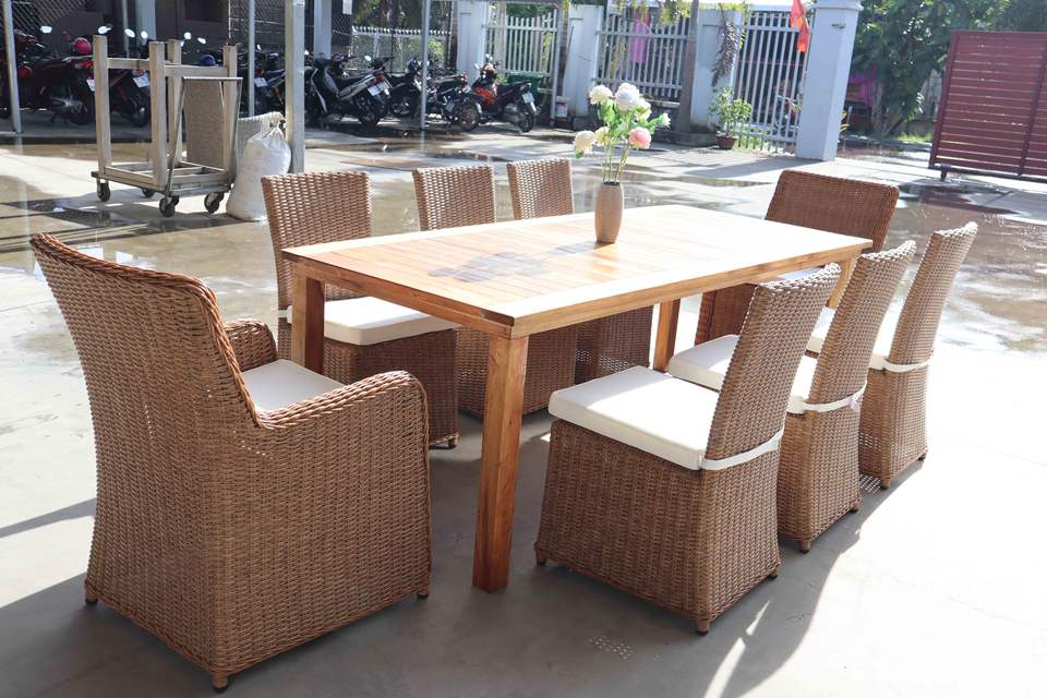 ชุดโต๊ะรับประทานอาหารกลางแจ้งสุดหรู PRCF-013 2026 ทำจากหวายทนทานทุกสภาพอากาศ พร้อมโต๊ะไม้สักและเก้าอี้ 8 ตัว