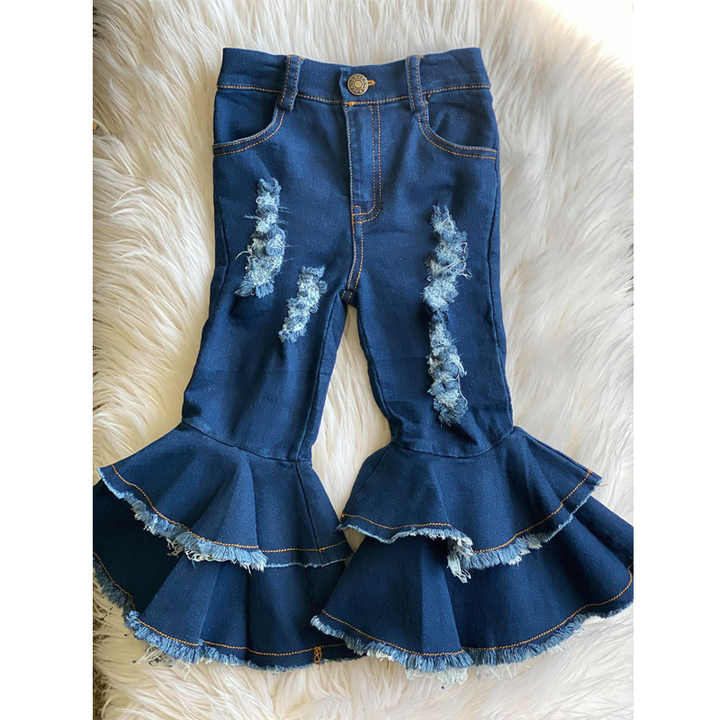 กางเกงยีนส์เด็กทรงขาบานสีน้ำเงินกรมท่า เอวยางยืด สำหรับเด็กผู้หญิง รุ่น PRO Toddler Bell-Bottom พร้อมระบาย
