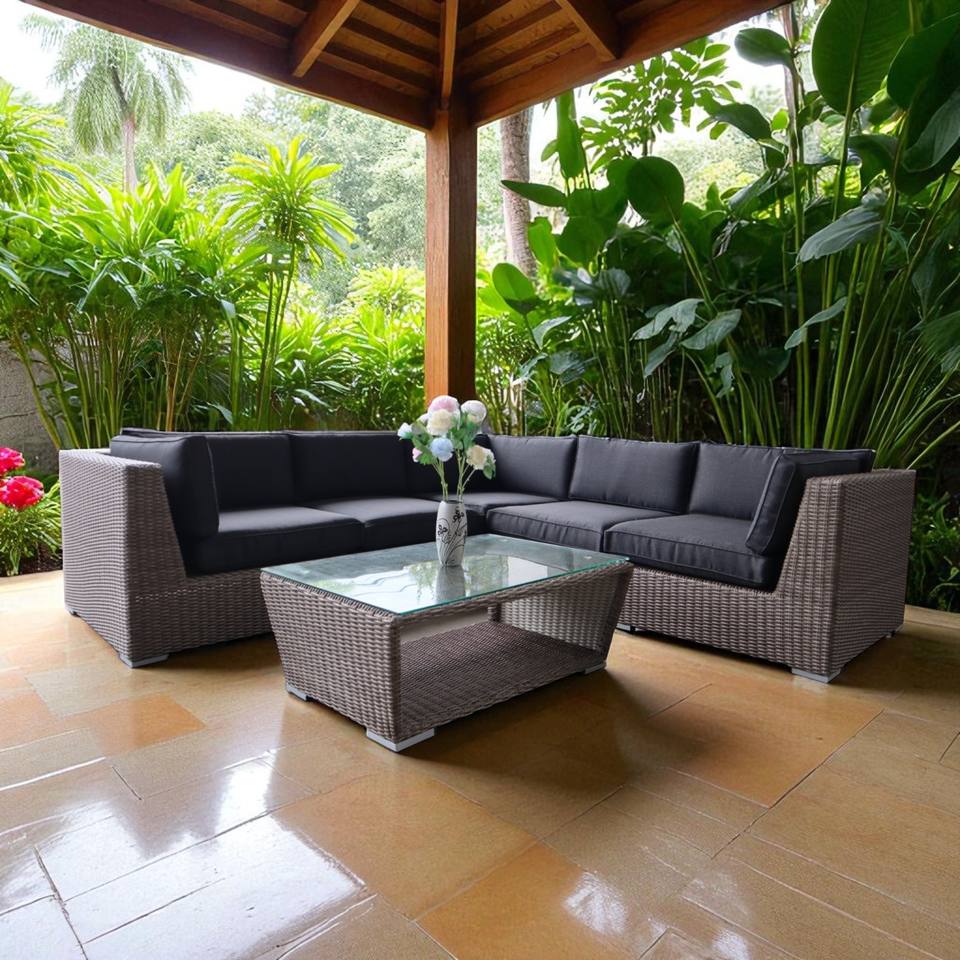 ชุดโซฟาหวายสังเคราะห์ PE ทอมือสไตล์โมเดิร์นหรูหรา รุ่น PRSF-C-TH5-HR สำหรับใช้งานกลางแจ้ง รูปทรงตัวแอล พร้อมเบาะรองนั่ง โต๊ะ เหมาะสำหรับสวน วิลล่า และโรงแรม