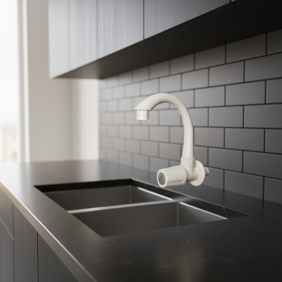 ก๊อกอ่างล้างหน้า ptmt พร้อมคอโค้งสำหรับห้องครัวและห้องน้ำก๊อกน้ำติดผนังพลาสติกสีขาวดีไซน์ทันสมัย