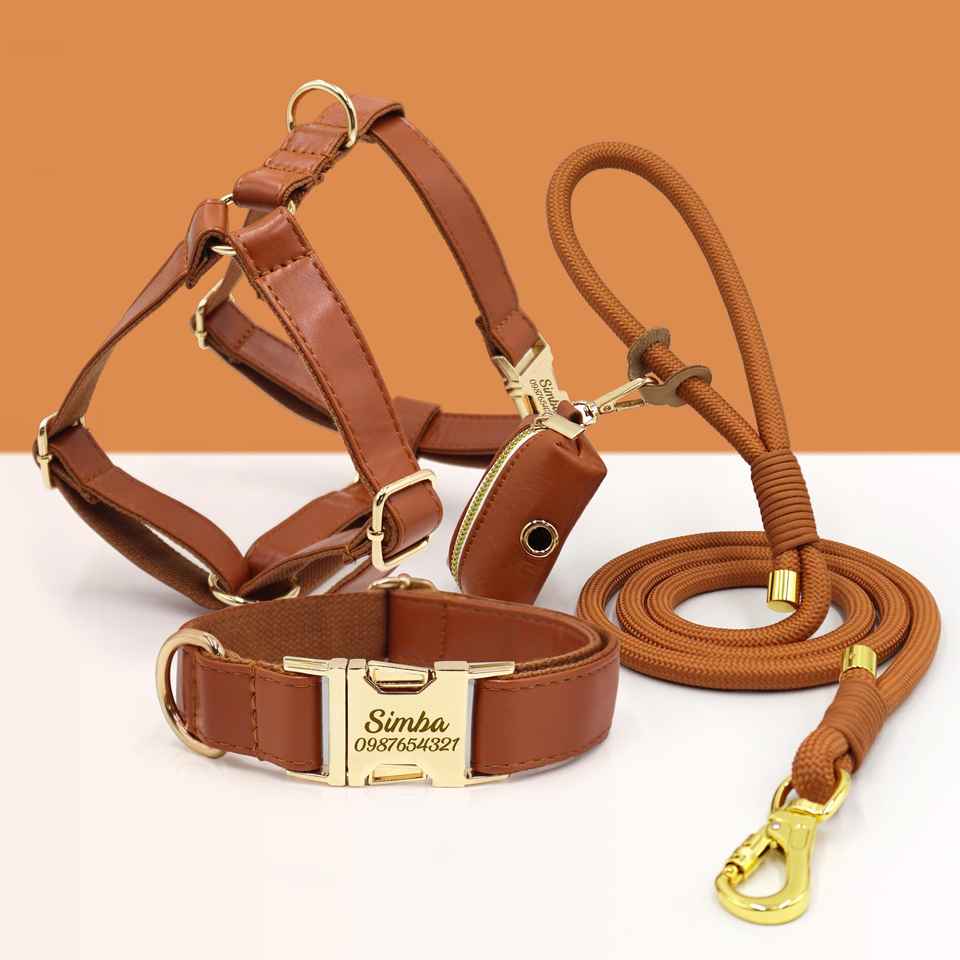 ปลอกคอหนัง PU, ปลอกคอ/สายรัด/ตะกั่ว/ถุงอึ, สายจูงปลอกคอสุนัขสีน้ำตาลอ่อน, หัวเข็มขัดโลหะสลัก, ของขวัญสำหรับลูกสุนัขงานแต่งงาน,