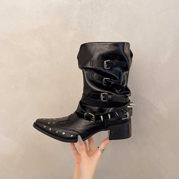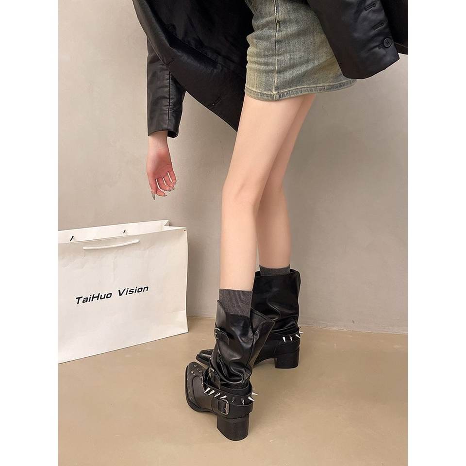 รองเท้าบูทส้นสูงแบบสวม หุ้มข้อกลาง 6-8 ซม. ส้นหนา ยาง หัวแหลม สไตล์คาวบอย แฟชั่น สวมใส่ได้ทุกฤดู