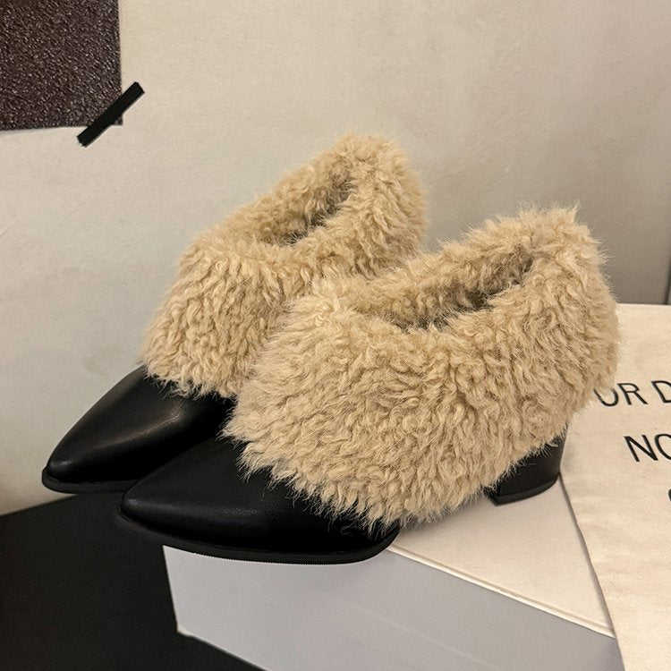รองเท้าบูทส้นสูงหุ้มข้อปลายแหลม (6-8 ซม.) ทำจากยาง PU บุขนสั้นเทียมสำหรับฤดูหนาว