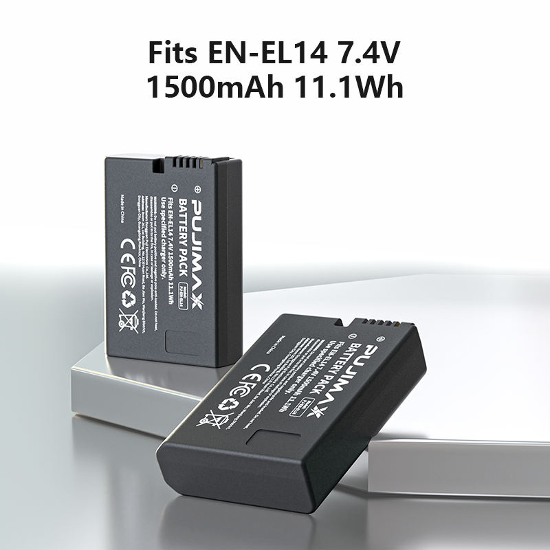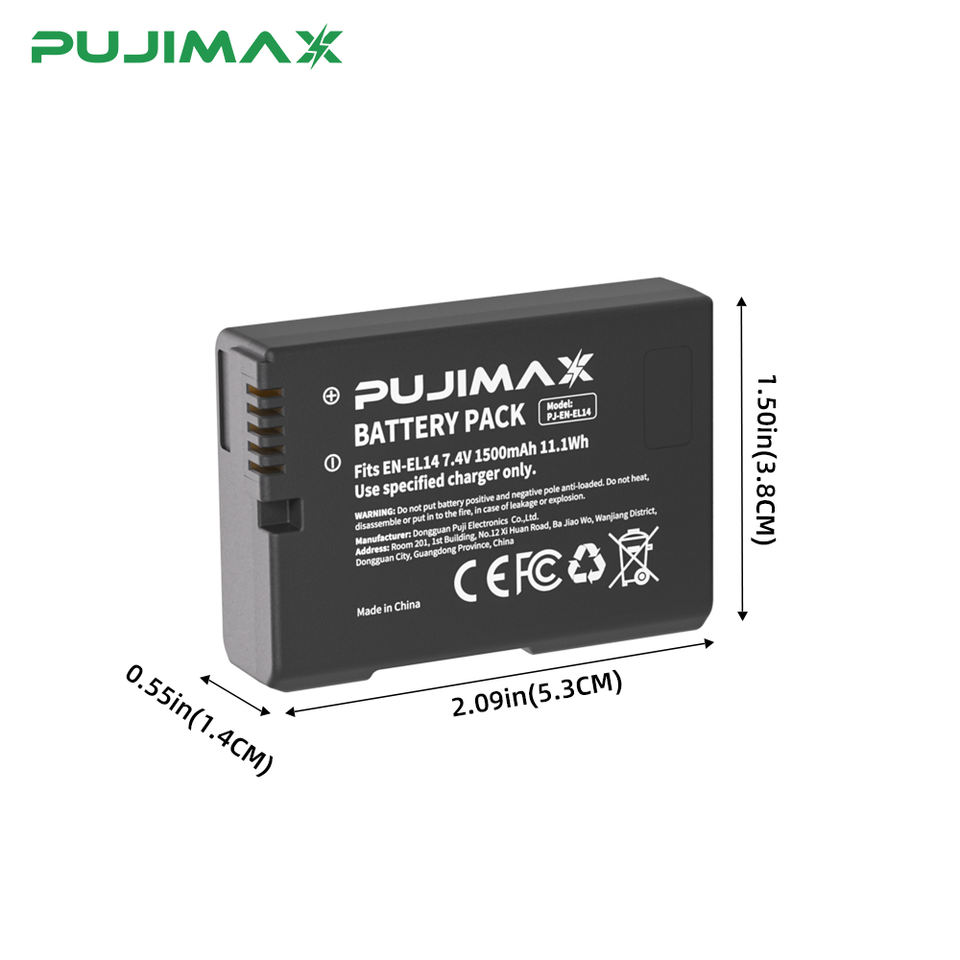 Pujimax ที่ชาร์จ EN-EL14แบบเดี่ยวมาพร้อมกับแบตเตอรี่ดิจิตอล7.4V 1500mAh 1ชิ้นสำหรับ Nikon D3100 D3200 D3400 D3500 D5600 D5300 D5100