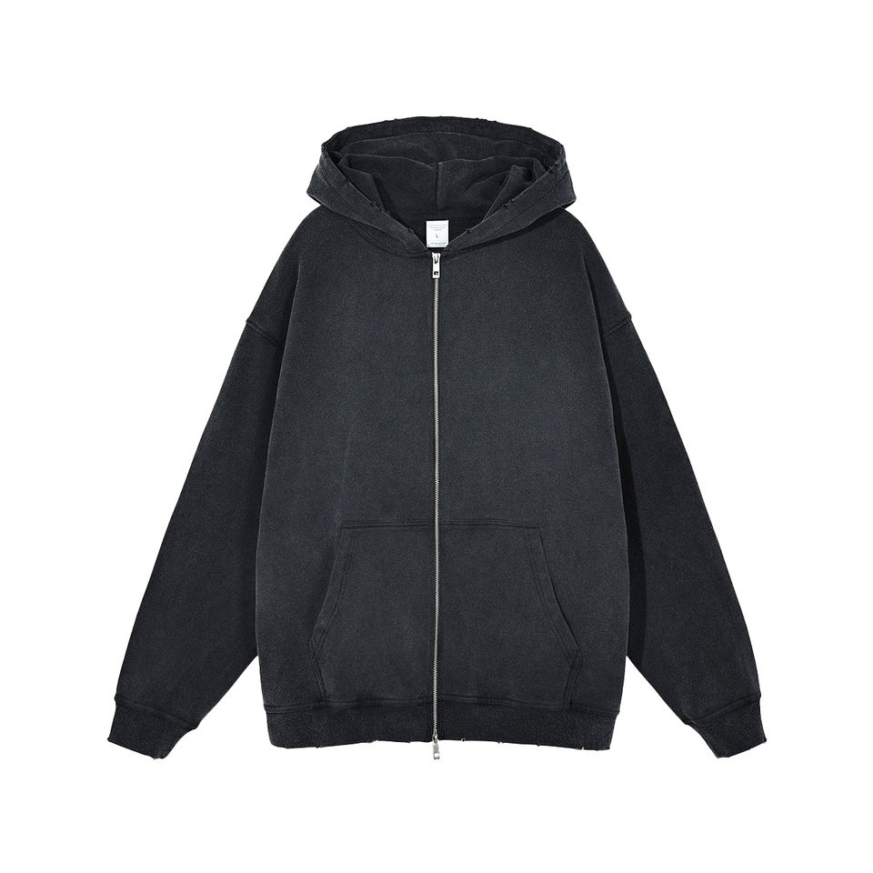 เสื้อฮู้ดดี้ผู้ชายทรงโอเวอร์ไซส์ ผ้าเทอร์รี่คอตตอนหนานุ่ม สไตล์เรโทร ลุคดิสเทรส ซิปหน้า ทรงบ็อกซี่ คุณภาพสูงจาก PURE Wholesale