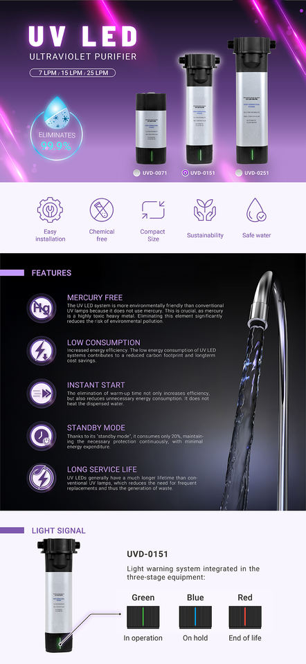 เครื่องกรองน้ำ PURICOM มาตรฐาน EU ไฟฟ้าแรงดันสูง พร้อมหลอด UV LED อัลตราไวโอเลต กำลังไฟ 24V DC 15 ลิตร/นาที 17 วัตต์ สำหรับฆ่าเชื้อโรค ใช้ในเชิงพาณิชย์