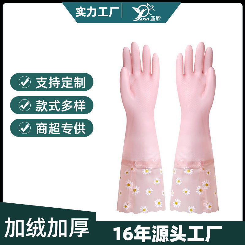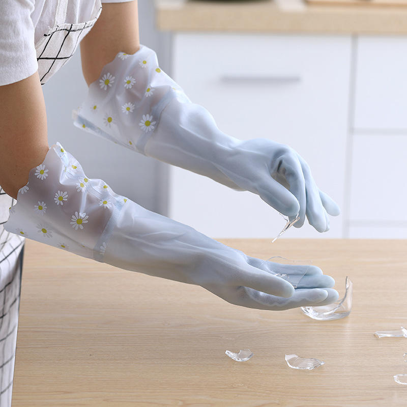 ถุงมือทำความสะอาดในครัวเรือน PVC ยาว 42 ซม. กันน้ำได้ หนาขึ้น พร้อมลายดอกเดซี่ สำหรับล้างจานในครัว ซักผ้า