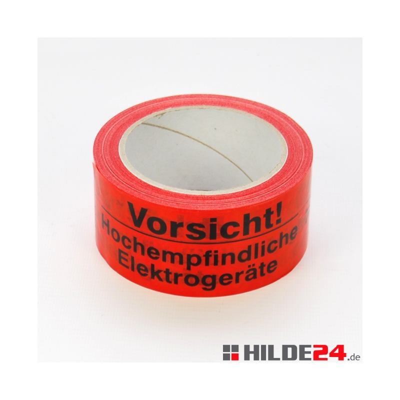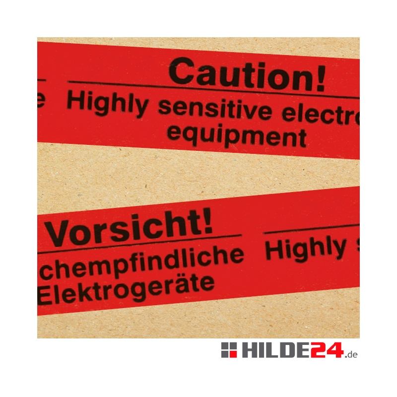 เทปเตือนภัยพีวีซี 50 มม. X 66 ม. ม้วน สีแดงพิมพ์ลายดำ คำว่า ระวัง! อุปกรณ์อิเล็กทรอนิกส์ที่มีความไวสูง ผลิตในเยอรมนีและอังกฤษ ทำจาก PE HDPE