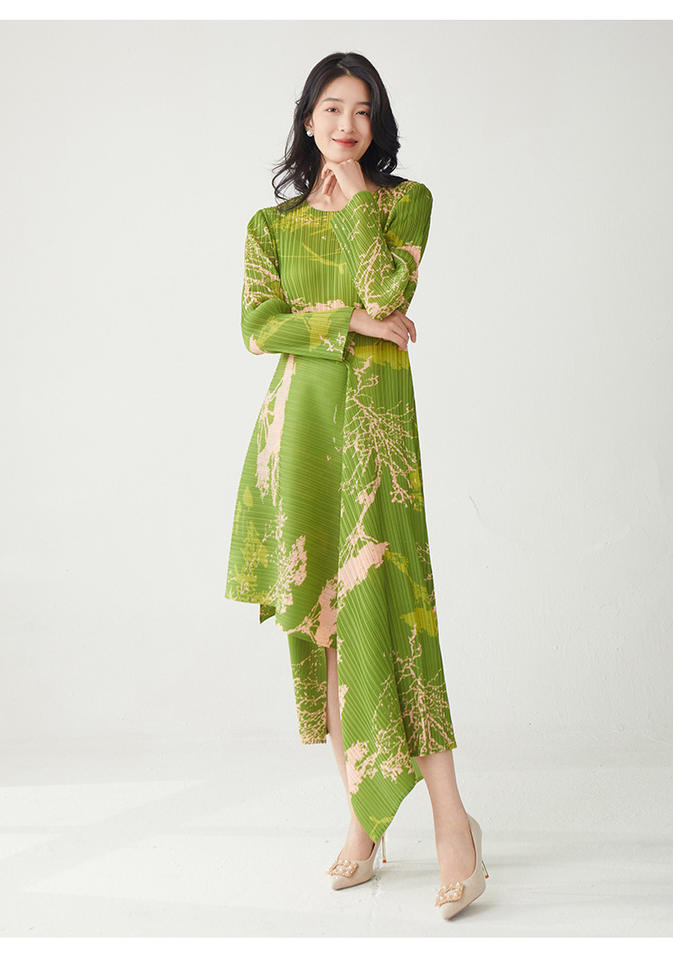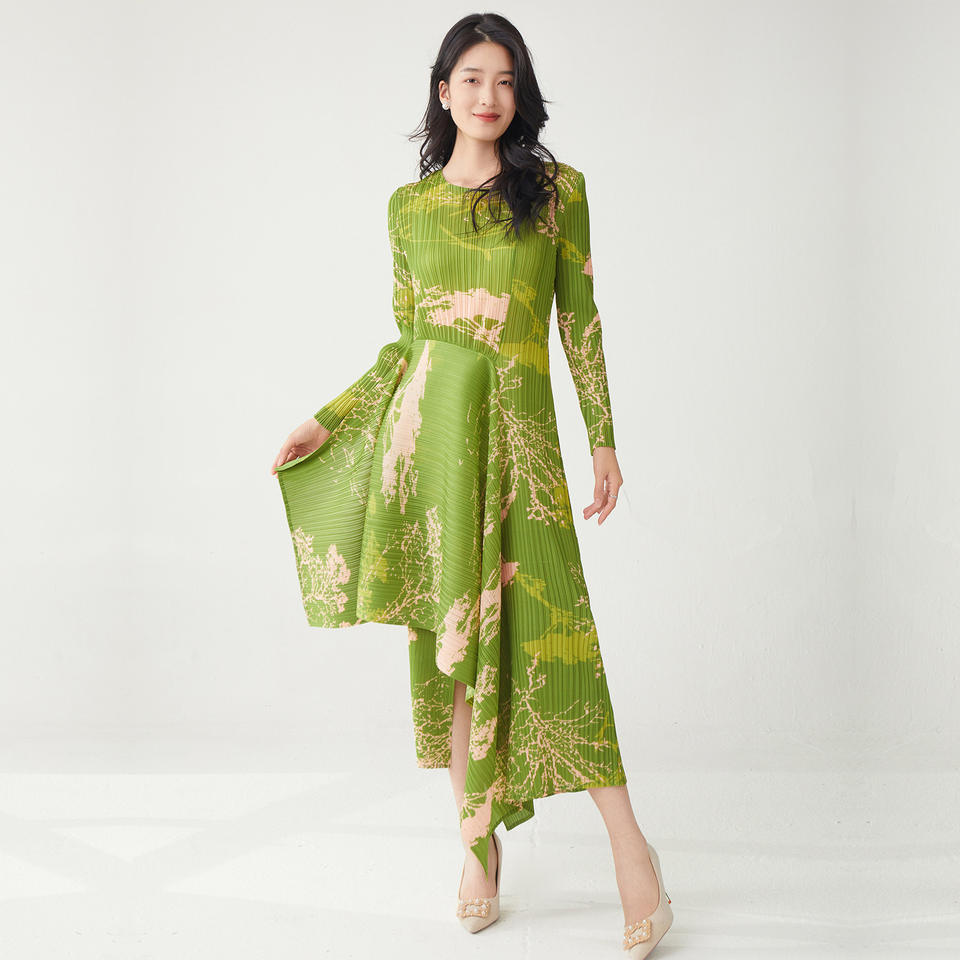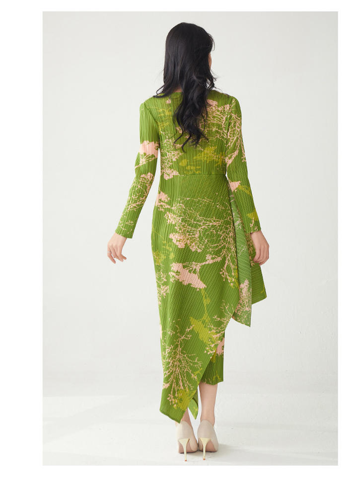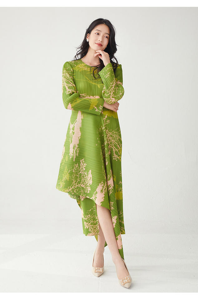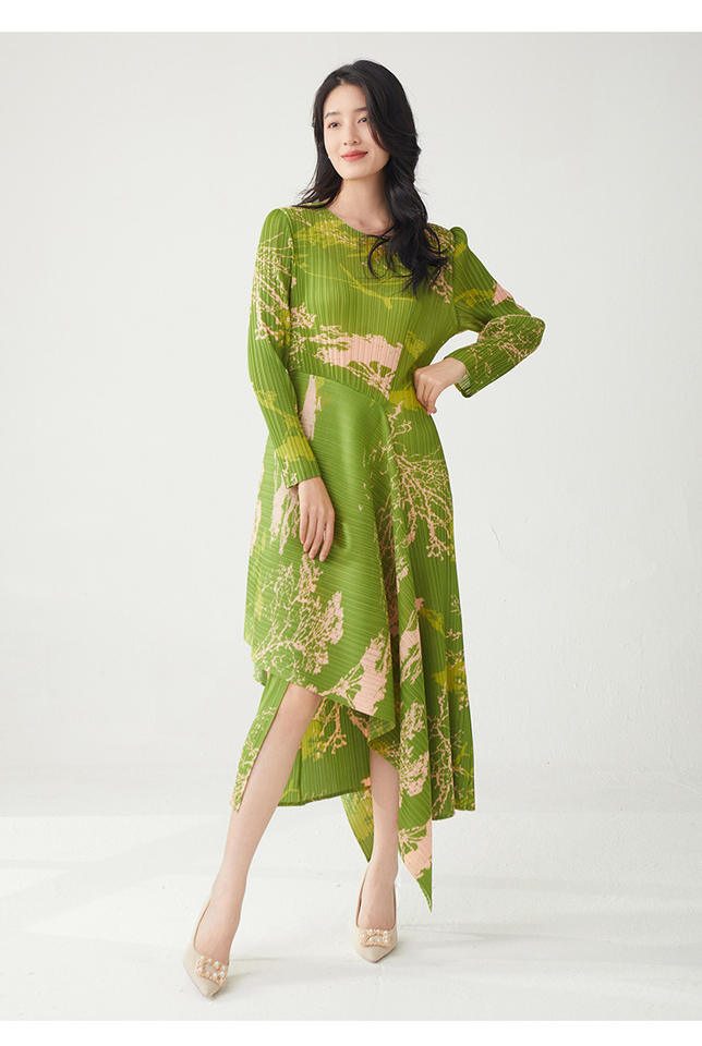 ชุดเดรสผ้าทอลายสีเขียวชมพู แต่งระบายจีบ ทรงเอ สำหรับผู้หญิง เนื้อผ้ามีเท็กซ์เจอร์ สวมใส่สบาย ดูสง่างาม ชายกระโปรงไม่สม่ำเสมอ ความยาวปานกลาง ซักได้ เหมาะสำหรับฤดูร้อน