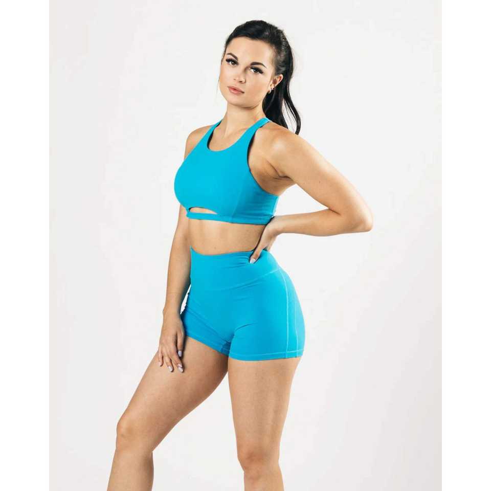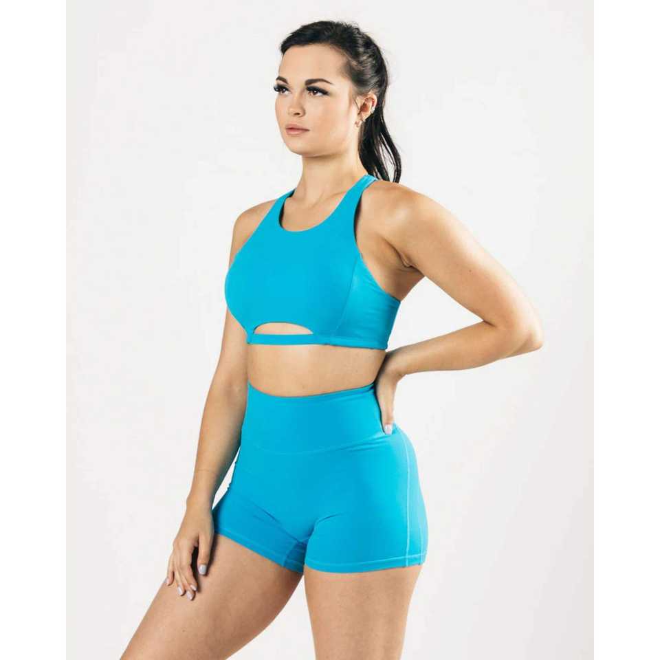 สปอร์ตบราสำหรับผู้หญิงสีฟ้าแปซิฟิกคอสูงไร้รอยต่อหนึ่งชิ้นพร้อมเสื้อแข่งแบบไร้ตะเข็บตะเข็บผูกหลังระบายอากาศได้ขนาดกลาง