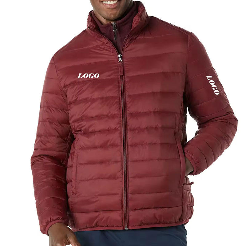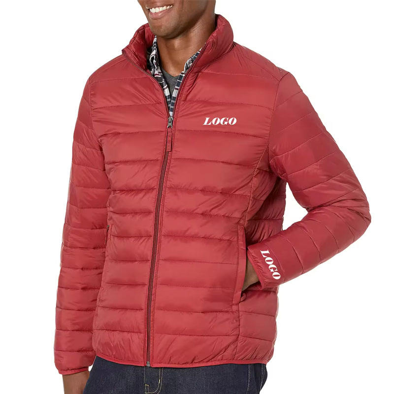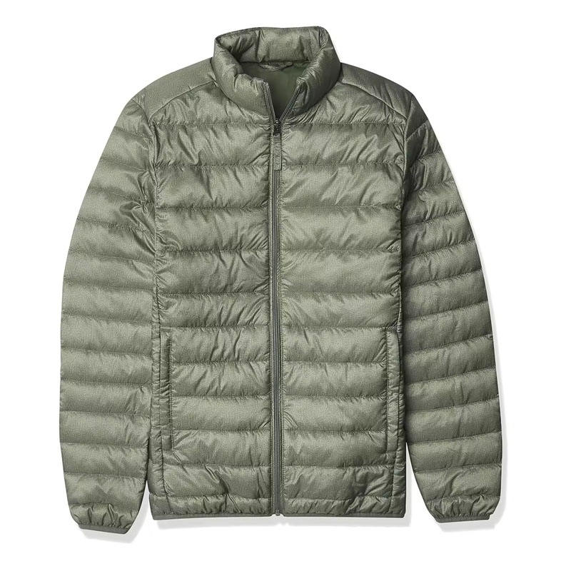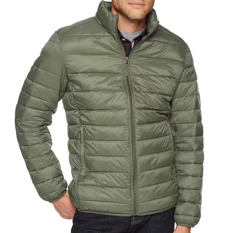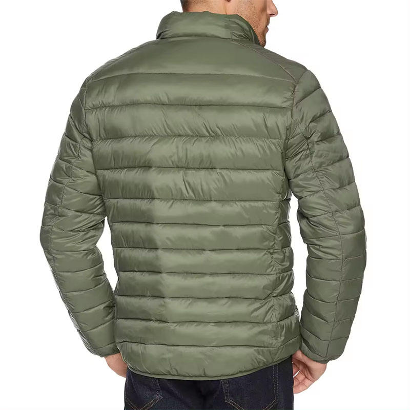 แจ็กเก็ตปลาปักเป้าผู้ชายแบบบรรจุได้แจ็กเก็ตสีเขียวมะกอกน้ำหนักเบากันลมมีปกตั้งเหมาะสำหรับแจ็คเก็ตขนเป็ดสำหรับเดินทาง