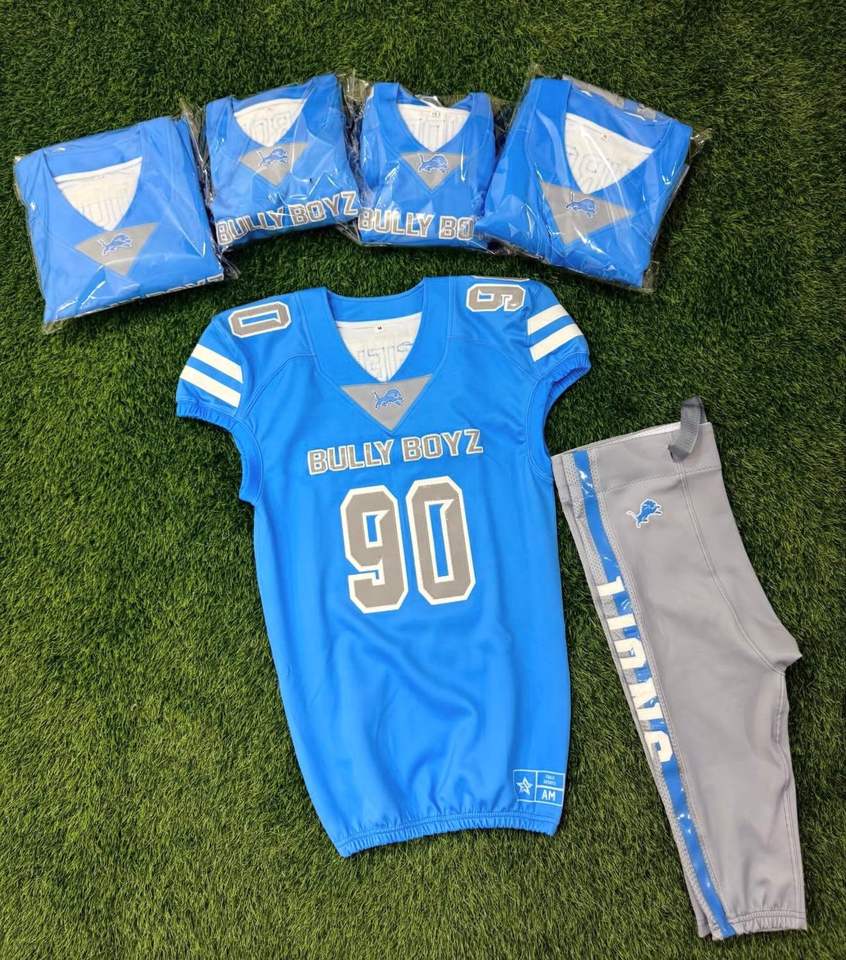 ชุดยูนิฟอร์มฟุตบอลแบบมีแผ่นรอง ซับลิเมชั่นเต็มตัว ผลิตจากโพลีเอสเตอร์ 100% ออกแบบโลโก้ได้ตามต้องการ ชุดยูนิฟอร์มแบบ Tackle ผลิตจากโรงงาน