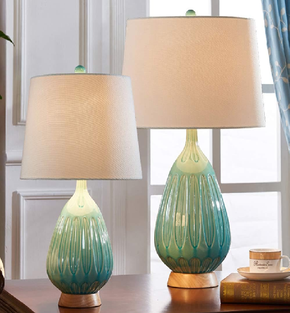 โคมไฟตั้งโต๊ะเซรามิกสไตล์ชายฝั่งคู่ในการเคลือบสีน้ำเงินเพื่อความผ่อนคลายด้วยพื้นผิวร่องและสำเนียงไม้ในราคาขายส่ง