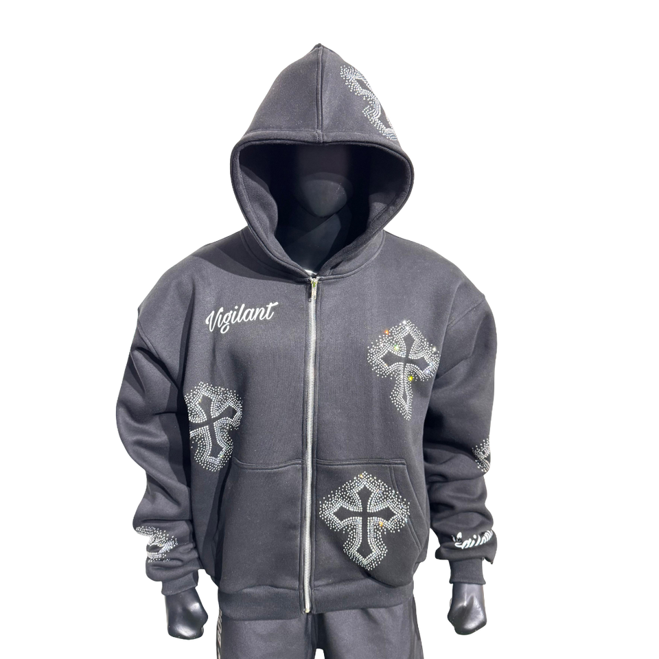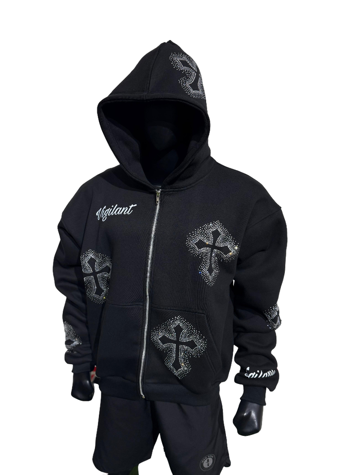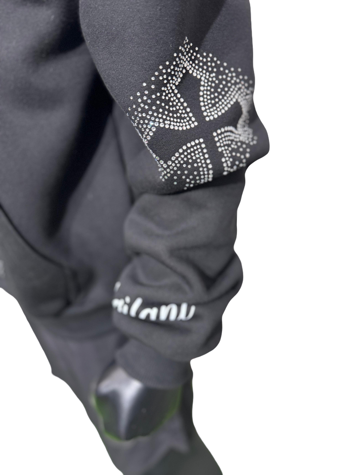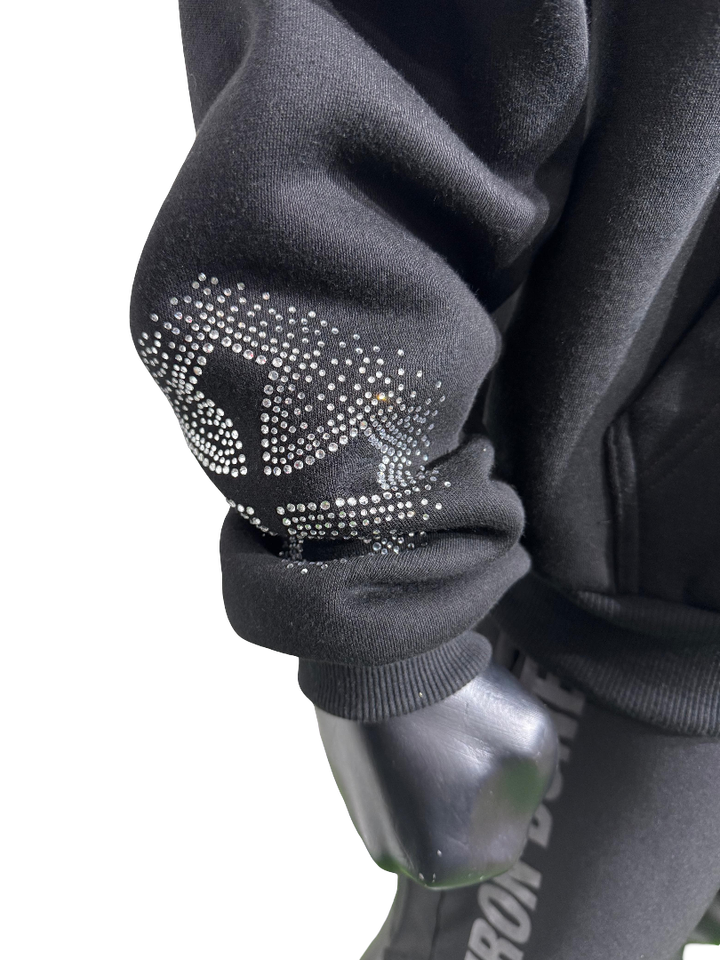 ชุดวอร์มมีฮู้ดผ้าฟลีซคอตตอนเทคนิคย้อมสีดำแบบวินเทจ ผลิตในปากีสถาน แบบ OEM พร้อมซิปเต็มตัว ไซส์พลัส ประดับด้วยคริสตัล