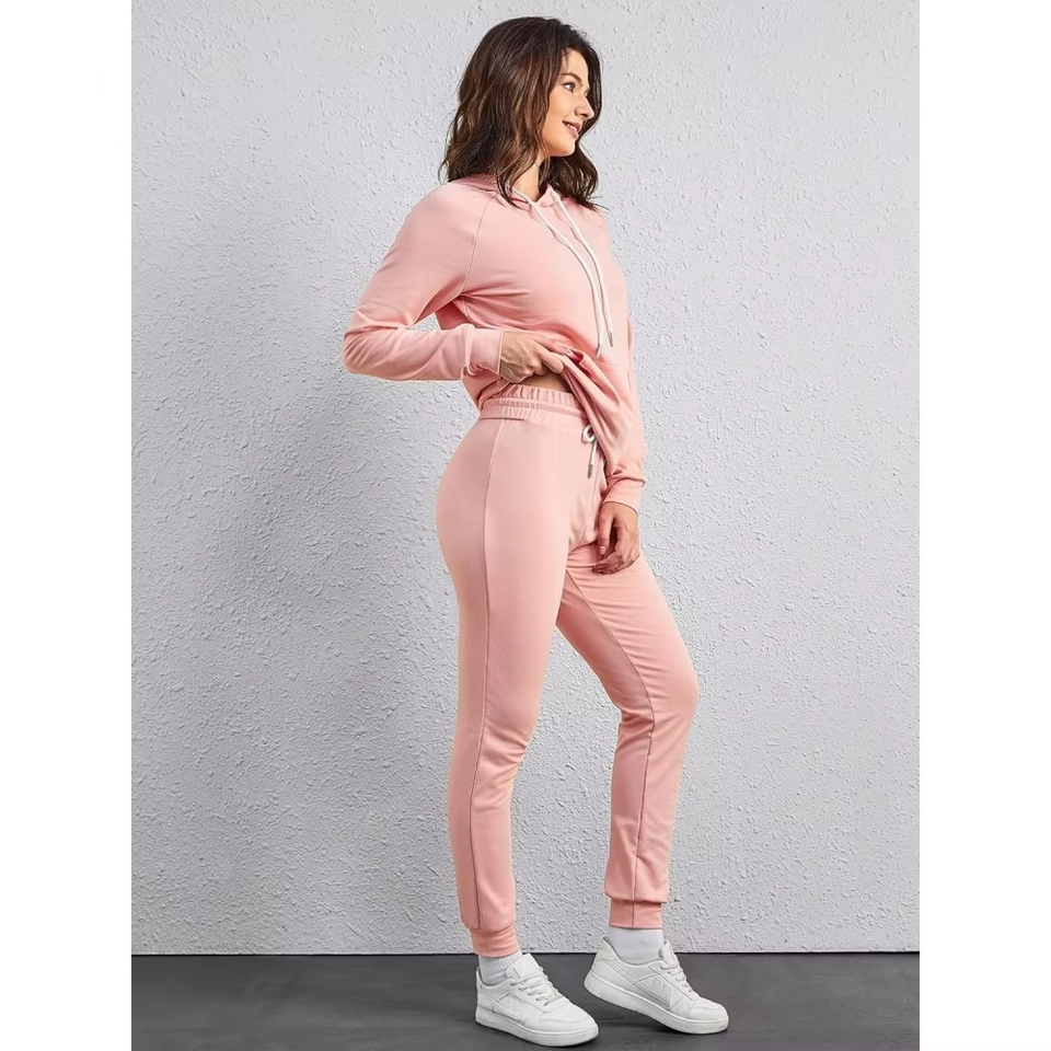 ชุดวอร์มลำลองแบบมีฮู้ดพิมพ์ลายราคาถูกสั่งทำได้จากปากีสถาน ชุดสองชิ้นสำหรับผู้หญิง ผ้าฟลีซคอตตอน 100%