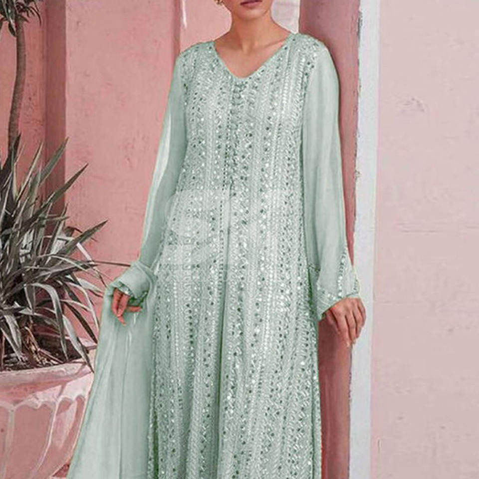 ชุดเสื้อผ้าสตรีแบบปากีสถาน ชัลวาร์ กามีซ 3 ชิ้น สำหรับสุภาพสตรี 4 ฤดู เสื้อปักลายและกางเกงทรงบานพร้อมผ้าคลุมไหล่แบบออร์แกนซ่า