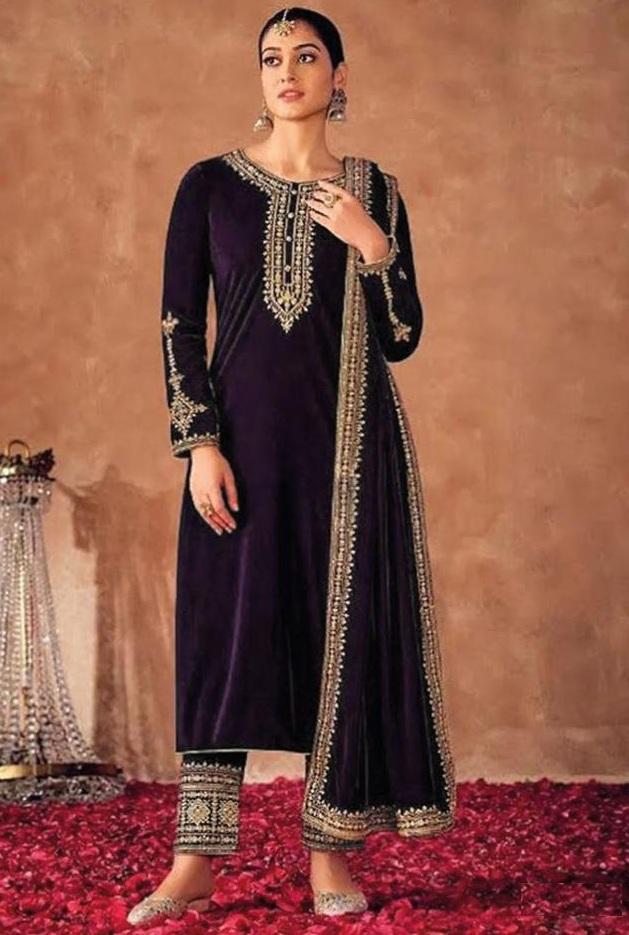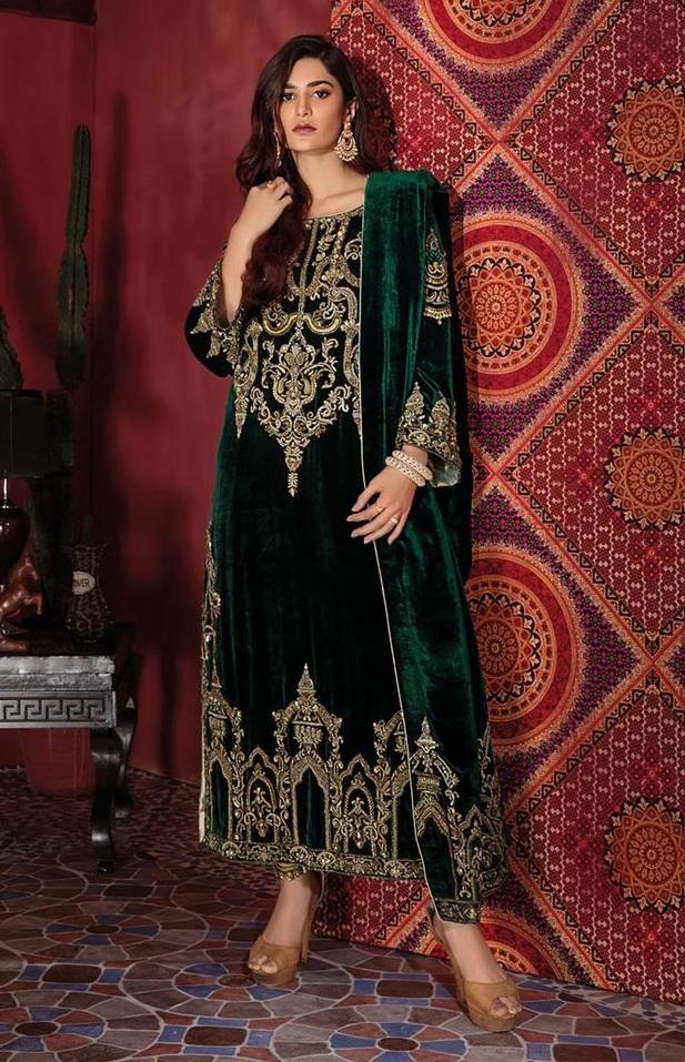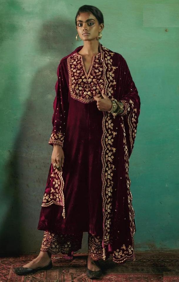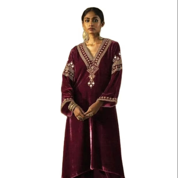 ชุดกำมะหยี่วิสโคสแบบไม่เย็บติดกันของปากีสถาน พร้อมงานปักลาย ประกอบด้วยกางเกงผ้าแจ็คการ์ดและผ้าคลุมไหล่