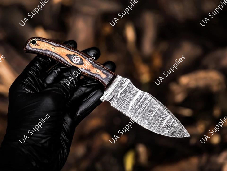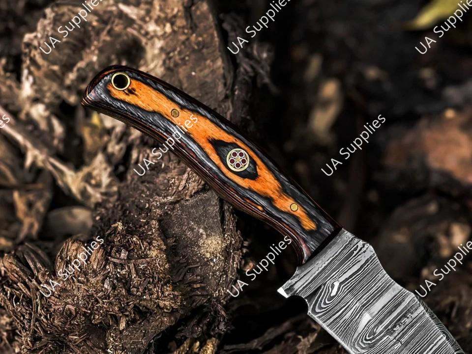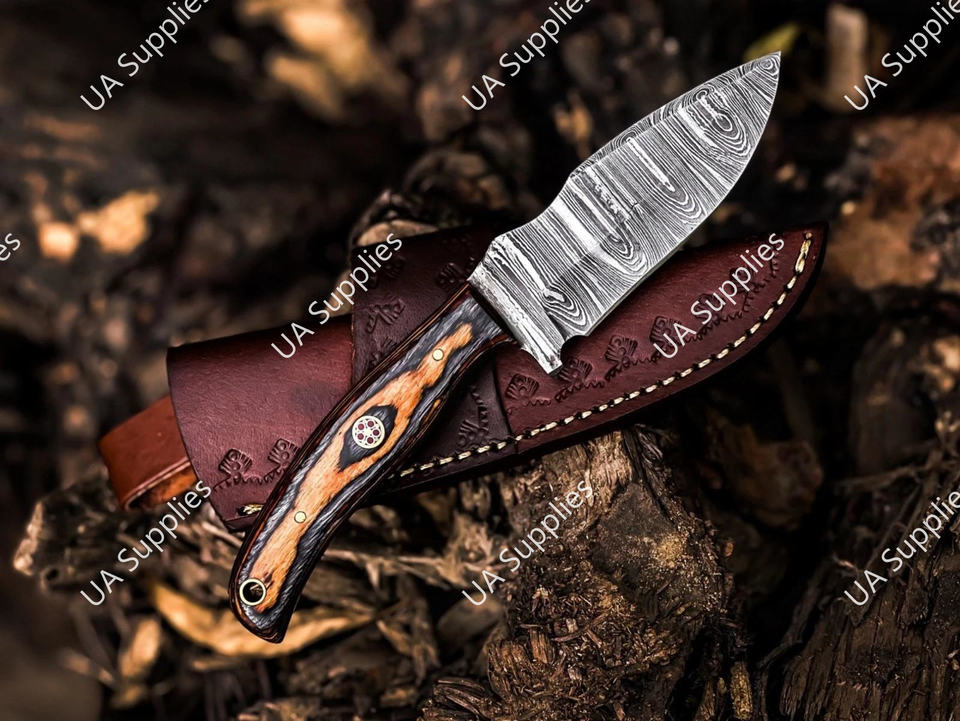 มีดใบตรงด้ามไม้ปักก้า ดามัสกัสสตีล พร้อมปลอกหนัง สำหรับล่าสัตว์และตั้งแคมป์ แบบพกพา รับผลิต ODM/OEM ขั้นต่ำในการสั่งซื้อน้อย