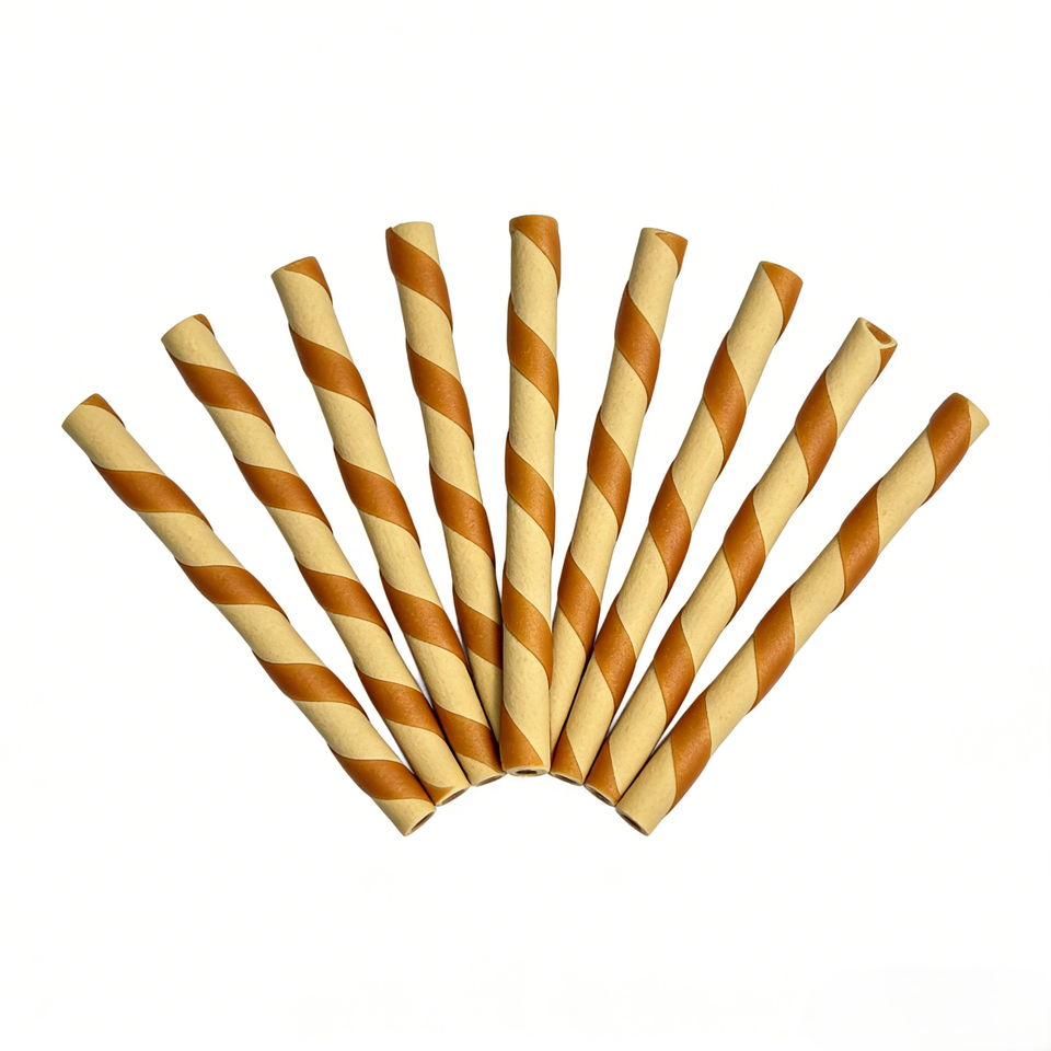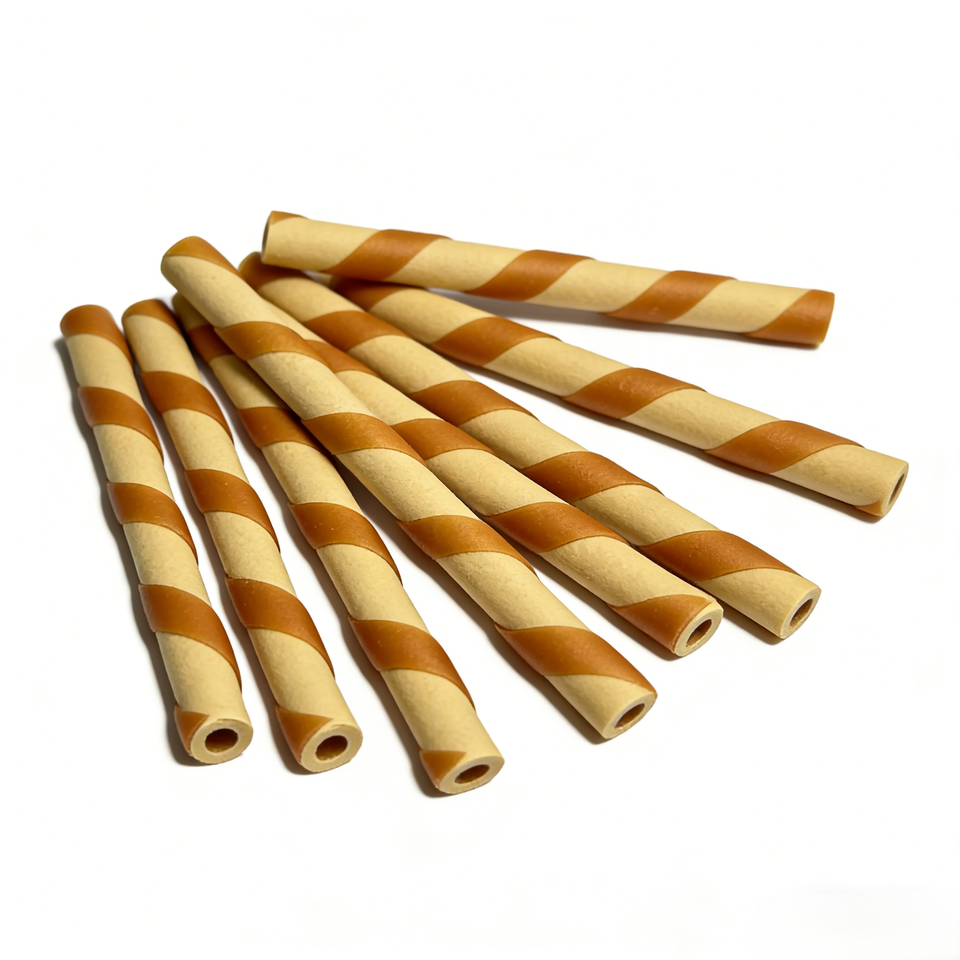 Keywords:5" MILK FLAVOR MINI TUBE WRAPPED WITH PEANUT BUTTER FLAVOR STRIPE