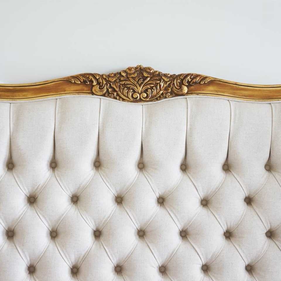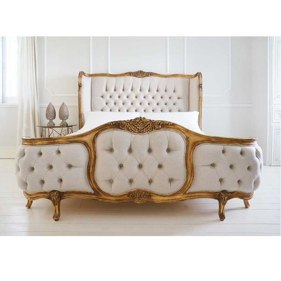 Palais Linen Upholstered Bed Handmade and Hand-Carved French Style Bed with Gold Frame and Linen Upholstery