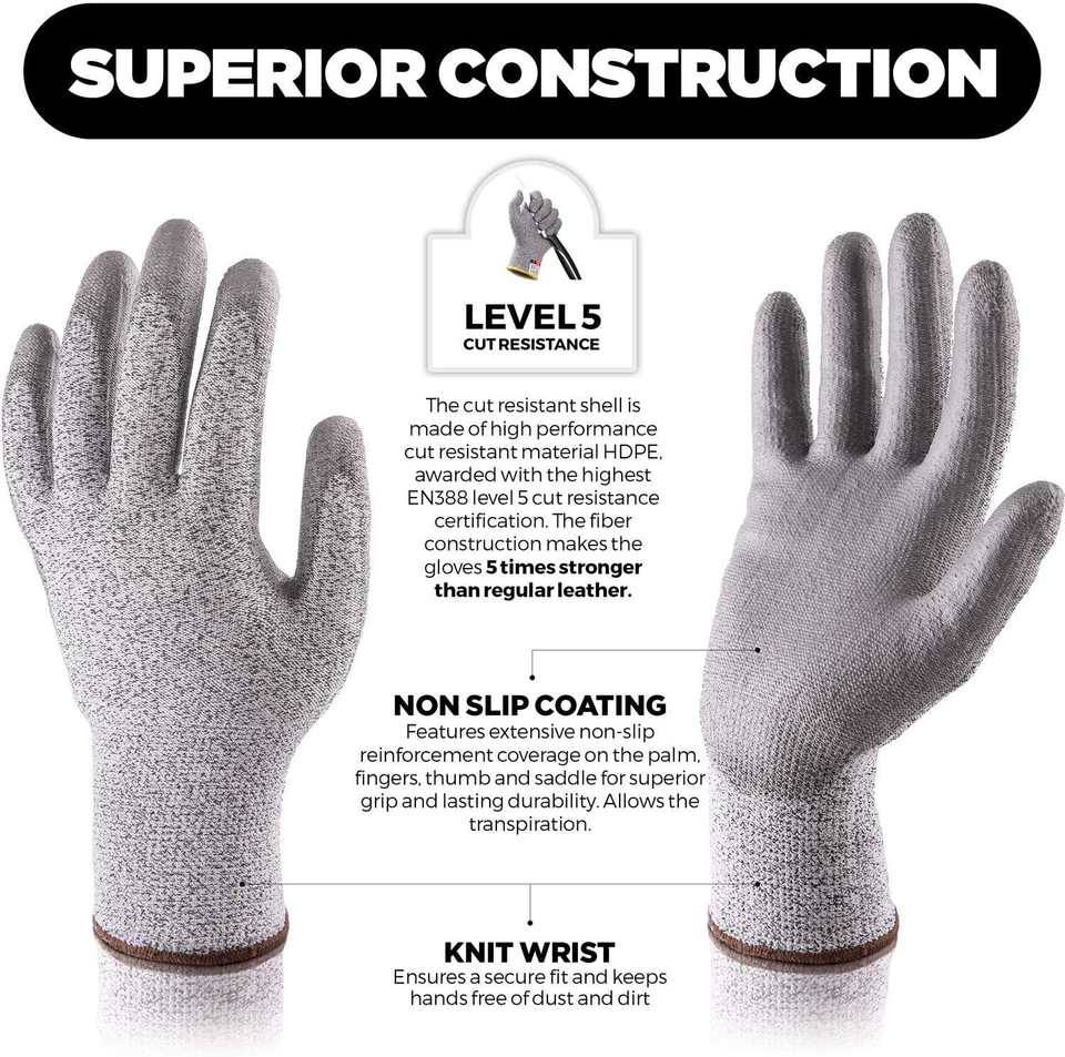 ถุงมือกันบาดเคลือบ PU บางเรียบเนียนบริเวณฝ่ามือและปลายนิ้ว ถุงมือป้องกันการบาดระดับ A3 A4 สำหรับงานนิรภัย ความคล่องตัวสูง เหมาะสำหรับงานประกอบและช่าง