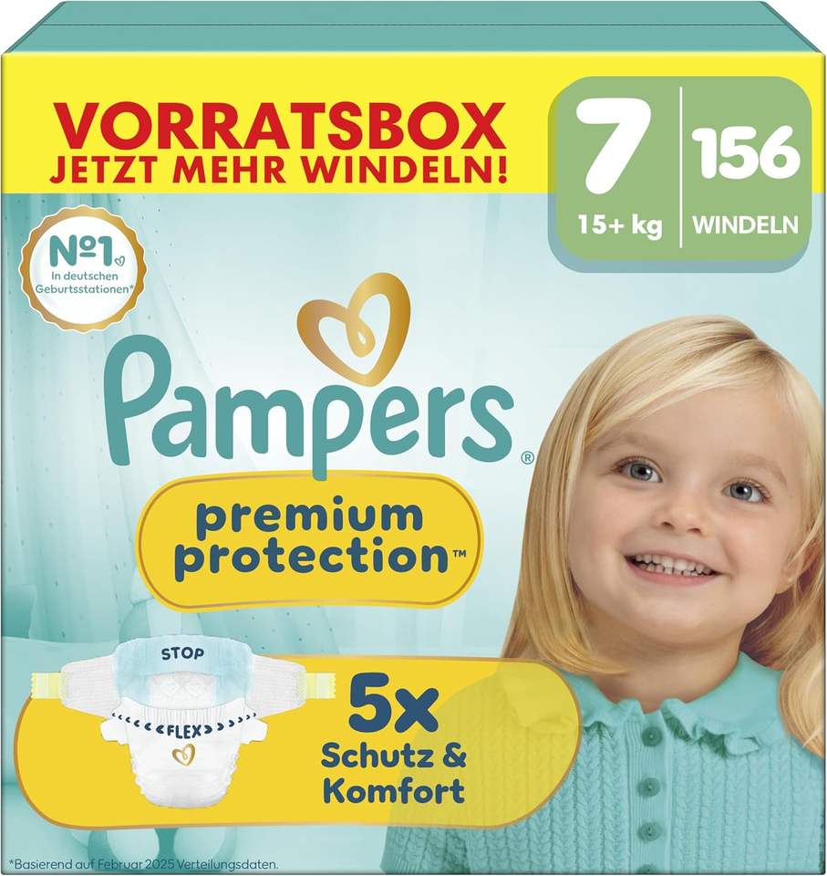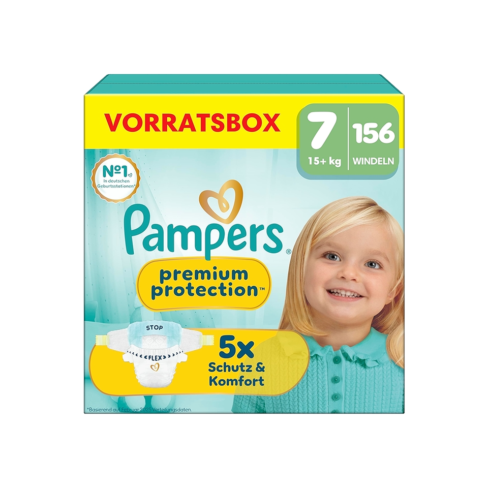 PampersPremium Protection Size 7, 156 Nappies, 15 kg+, Our No. 1 Skin and Leak Protection