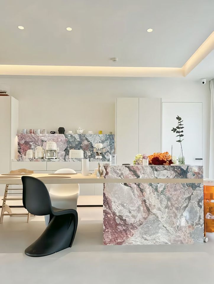 PANDORA เกาะครัวหินอ่อนน้ำตกกลางเกาะหรูหราพร้อมที่เก็บของเคาน์เตอร์ครัวที่ทันสมัย