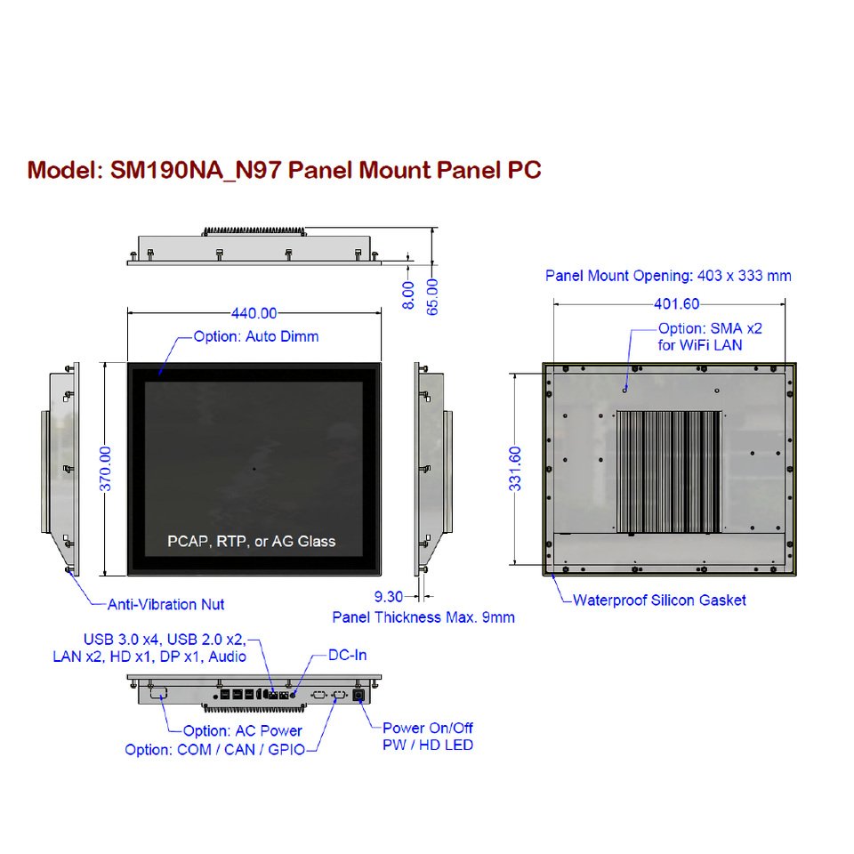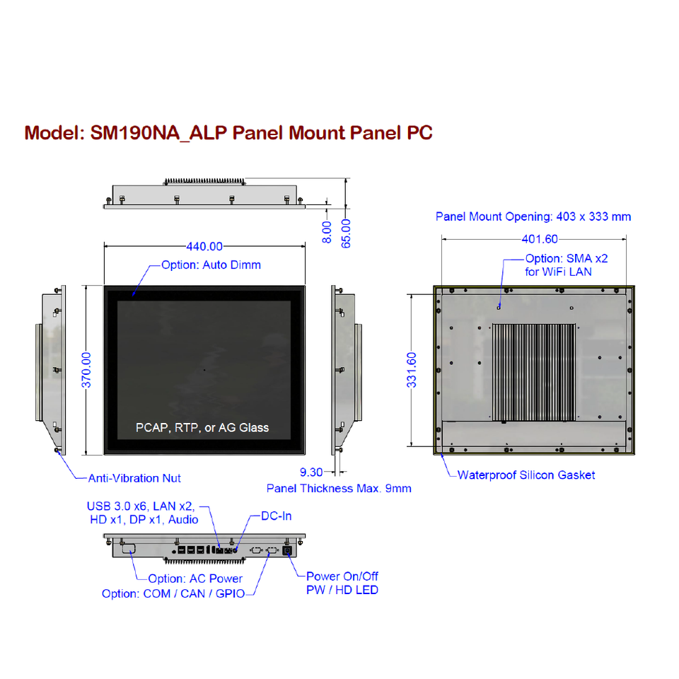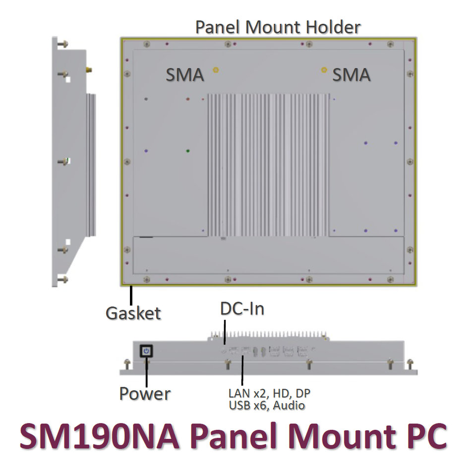 HD, DP, X6 USB, X1เสียง, ตัวเลือก DC-in: COM, GPIO, พอร์ต CAN