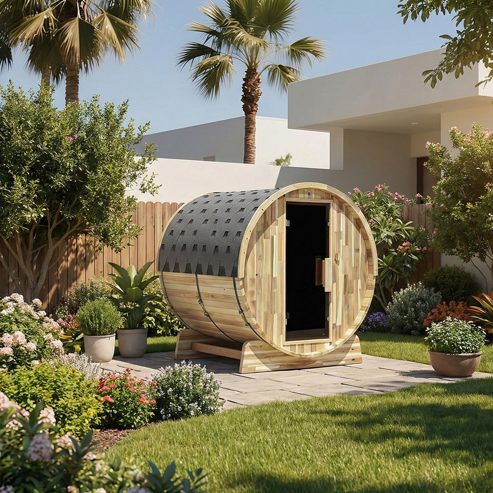 ซาวน่ากลางแจ้งทรงกระบอกแบบพาโนรามาสมัยใหม่ พร้อมกระจกบานใหญ่ด้านหน้า ทำจากไม้ซีดาร์ใส เหมาะสำหรับวิลล่า สปาในสวนหลังบ้านที่มีวิวสวยงาม