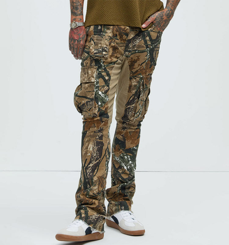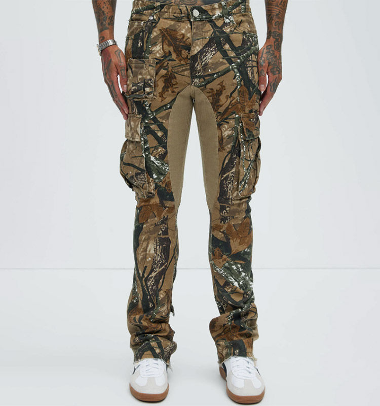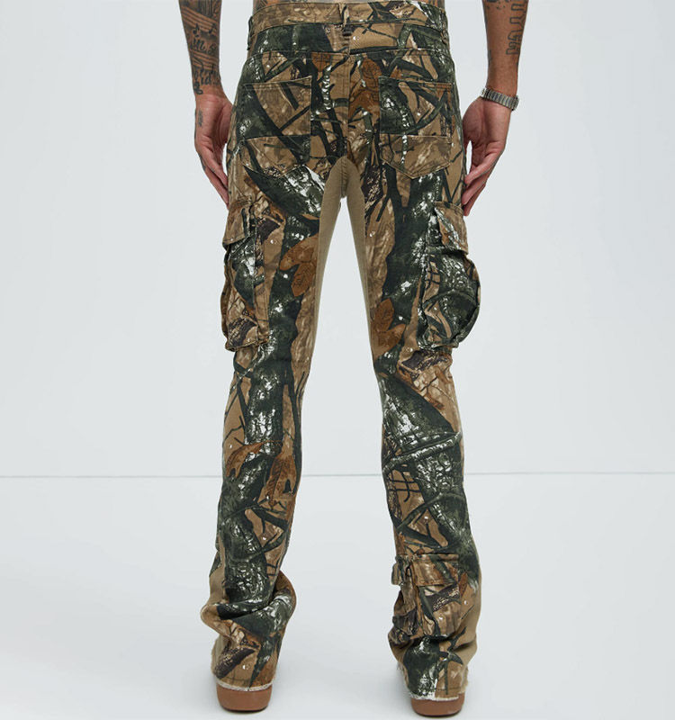 ผู้ผลิตกางเกงขายาวแบบมีกระเป๋าปะติดตามสั่ง กางเกงคาร์โก้สไตล์สตรีทแวร์ กางเกงจ็อกเกอร์ผู้ชายทรงขาบานพิมพ์ลายกราฟิกแบบซ้อนทับ