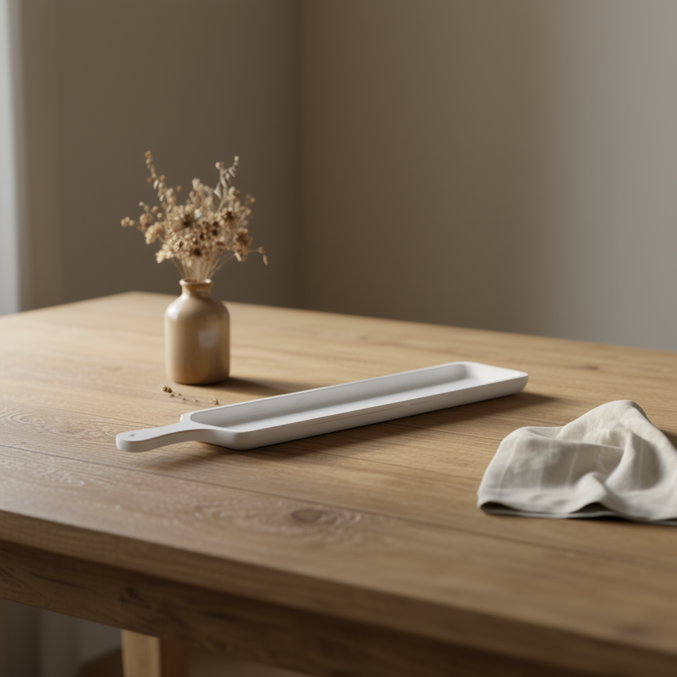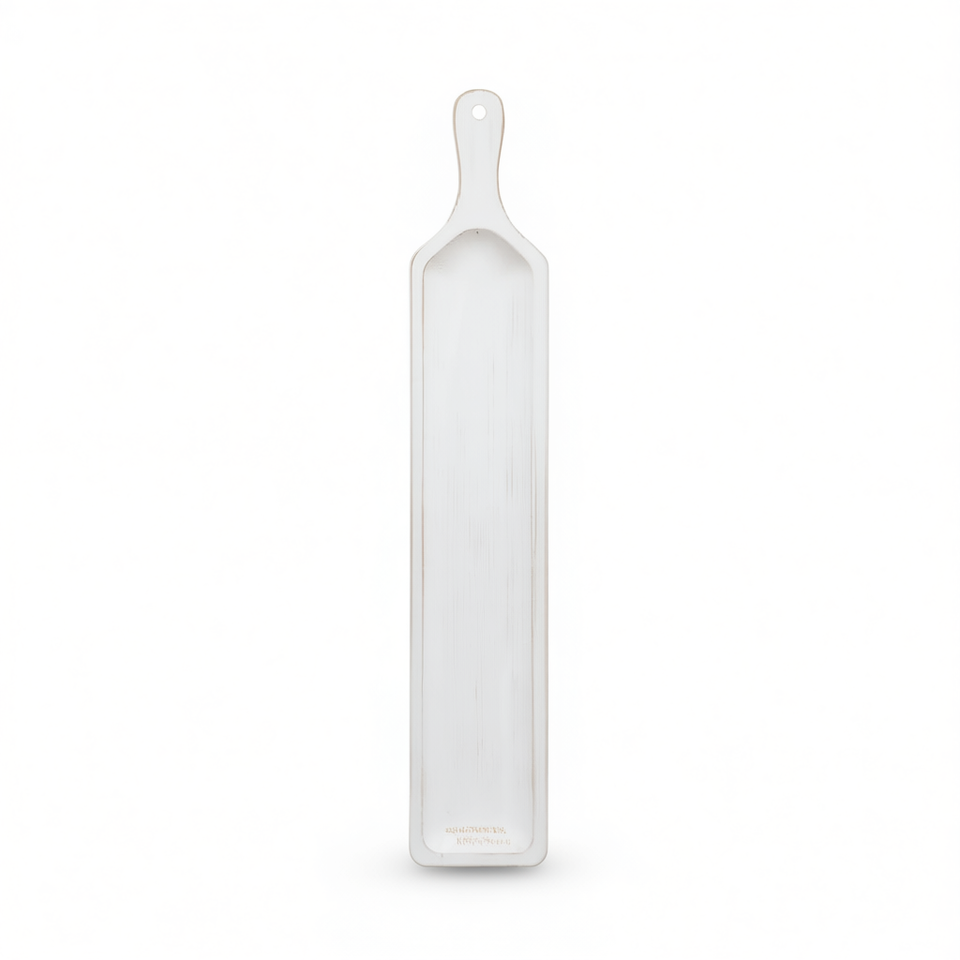 ถาดเสิร์ฟไม้ทรงยาวแคบ Parisloft สีขาว รูปทรงสี่เหลี่ยมผืนผ้า ทำจากไม้สน พร้อมหูจับ ใช้ตกแต่งห้องครัว ห้องรับประทานอาหาร หรือเป็นของตกแต่งกลางโต๊ะ