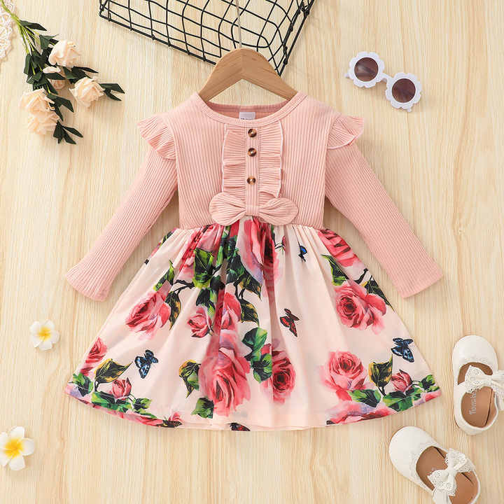 ชุดเดรสเด็กผู้หญิงลายดอกไม้สีชมพูสำหรับงานปาร์ตี้ เสื้อผ้าเด็กคุณภาพสูงสำหรับฤดูใบไม้ผลิ